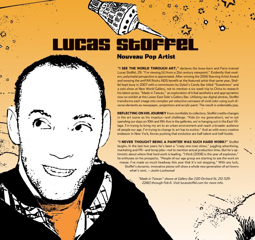 Last years recipient of New Yorks Starving Artist Award and a two - time best - selling artist at the Starving Artist Ball, multi-media pop artist Lucas Stoffel has been commissioned by private collectors all over the world. In 2007 Stoffel was honored as the selected artist for the amfAR Rocks benefit for AIDS research, and went on to be selected to feature his work in AM New Yorks Premiere Art Rocks Event, before being commissioned by Raplh Laruen'sDaughter Dylan, 8 works titled Sweetness for her famed Candy Boutique on the UES for the candy inspired series Sweetness. Stoffel ended the summer of 2007 displaying his Award- winning project iCon at the Prince George Gallery on 27th Street, before heading off to wo rk on his current project in Taiwan.
