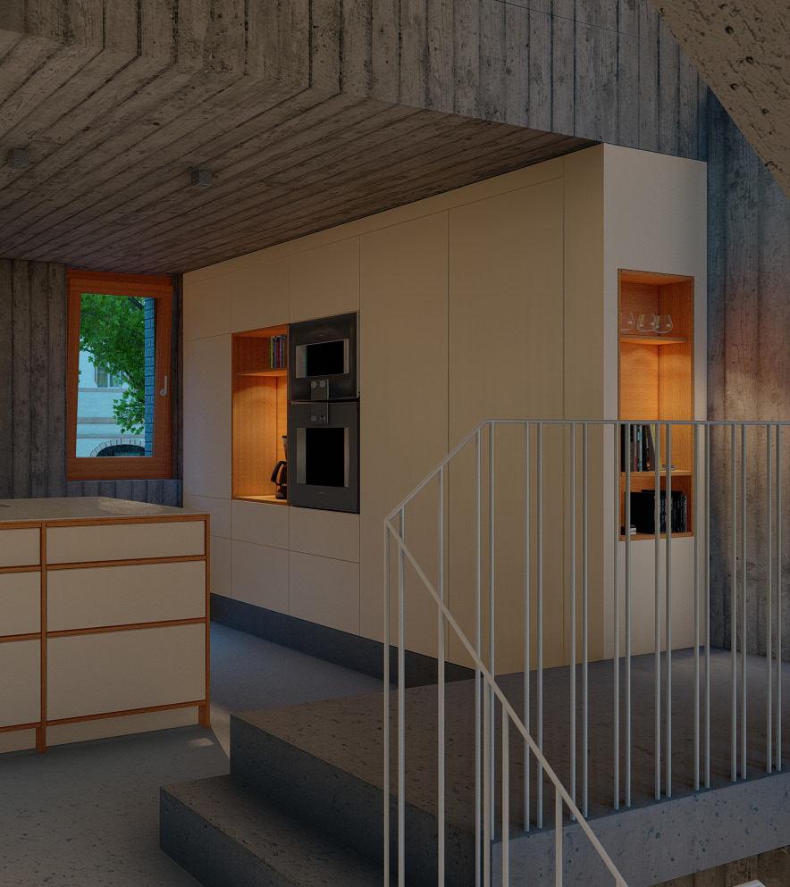 The overall form of my kitchen is strongly influenced by the stairs and their platform. To construct the floor plan in an isle and a row of cupboards avoids non- beautiful detailing in the corners and allows to freely organize the elements, to reach a kitchen for an ideal cooking process.
