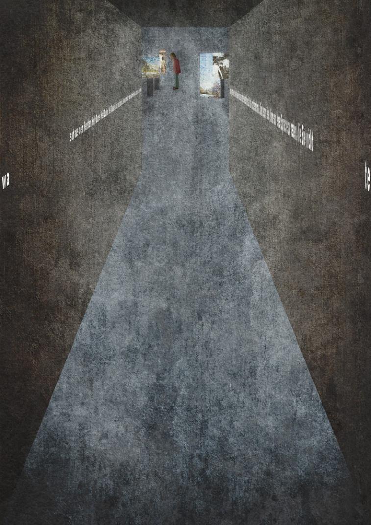 Inside of the tunnel is a philosophical introduction, which you can read on the previous page. The Tunnels are distinguished in two sides: Tunnels where you feel reliefed when you exit - and tunnels where you feel joy when you exit. Each tunnel has its own story, that shall emphasize the effect its ending has. The story is written on the sides of the elements, shown in a graphic on the