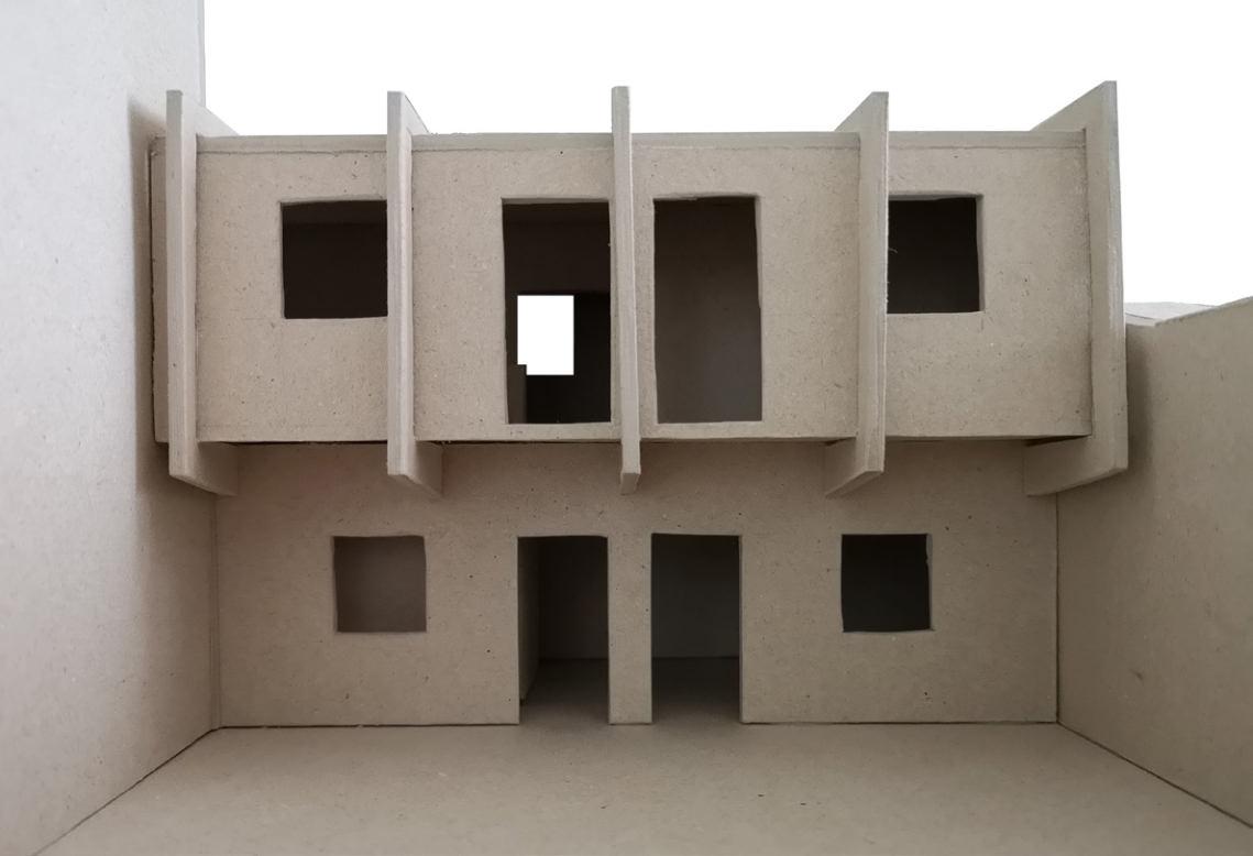 from the court, already had an interesting symmetrical look, so i decided to just copy the wall openings. I took the chance that the concrete beams were carrying a cantilevered roof and made the second floor a little bigger to get more space inside.