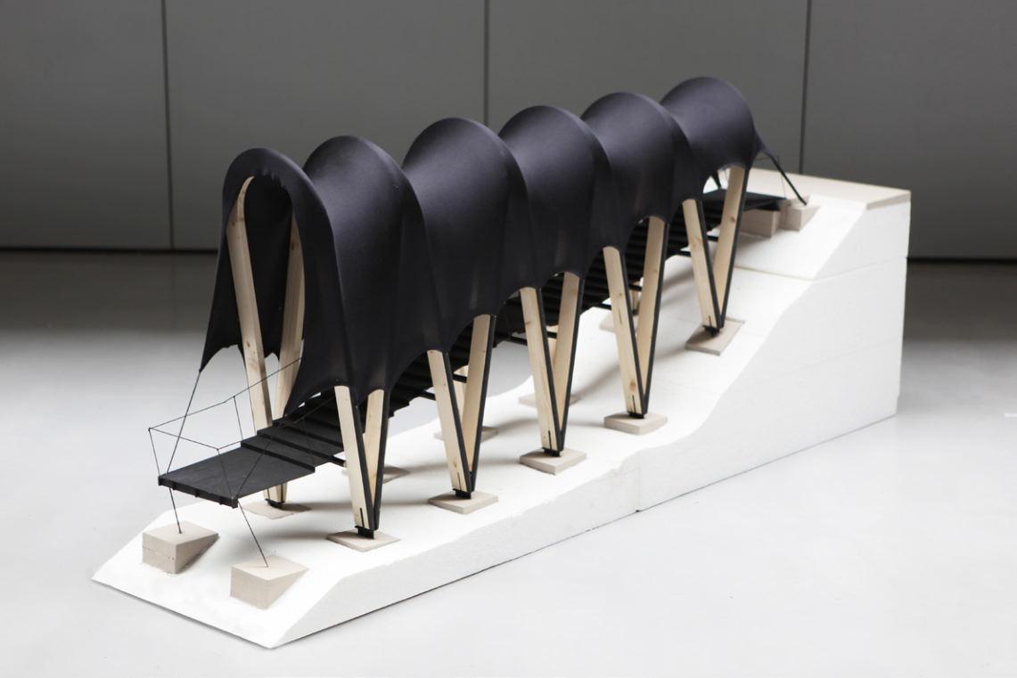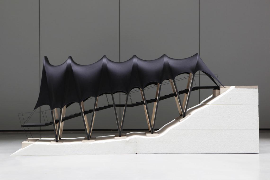 The membrane needs to be connected to the ground on both endings of the construction. We made use of a very standard ground detail, that we arranged in our model to generate a clean ending and to shape the membrane.
