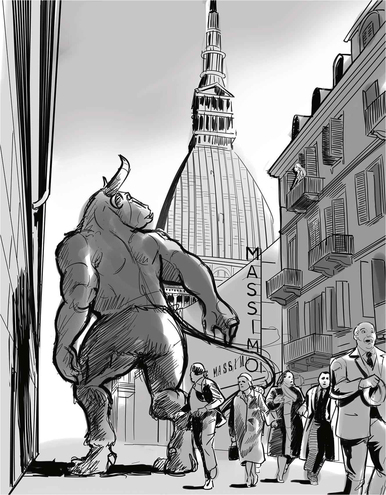 Giunto all’altezza di via Montebello, con un poderoso pugno distrugge la passerella che collega i portici ed avanza verso corso San Maurizio, fermandosi poco prima del cinema Massimo. Una ragazza, affacciata al balcone di un palazzo attira la sua attenzione. Il Minotauro la afferra e l a porta con se’, riprendendo la sua devastante marcia.