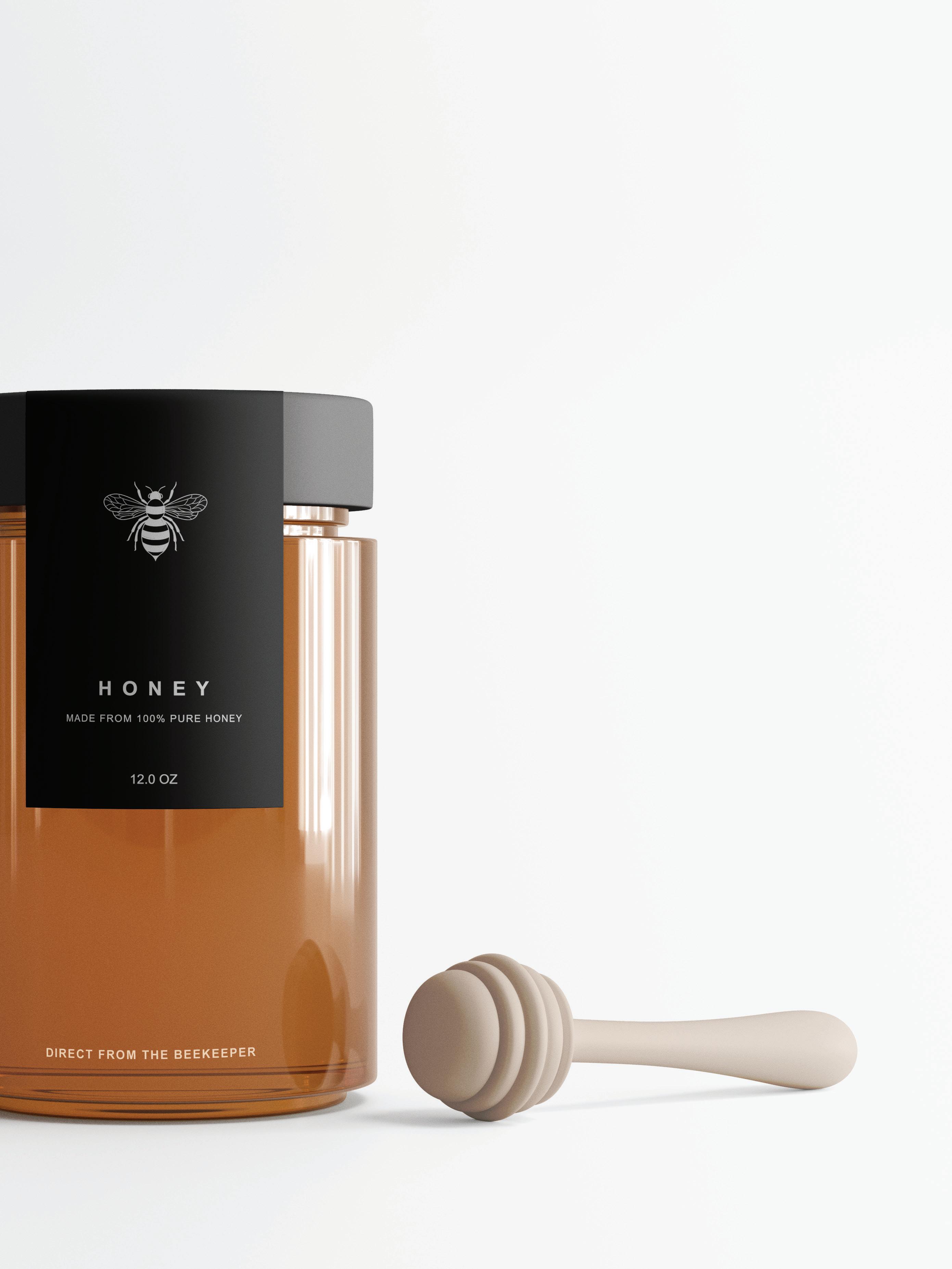 Below, in smaller font, “DIRECT FROM THE BEEKEEPER” is a testament to the honey’s source, ensuring consumers of its authenticity and the care taken in its harvesting. The centerpiece of the label is a stylized bee illustration, which not only serves as a brand identifier but also as a tribute to the creatures responsible for the product. The image is complete with a honey dipper lying next to the jar, its wood material and natural color suggesting a handcrafted tool for serving the honey.