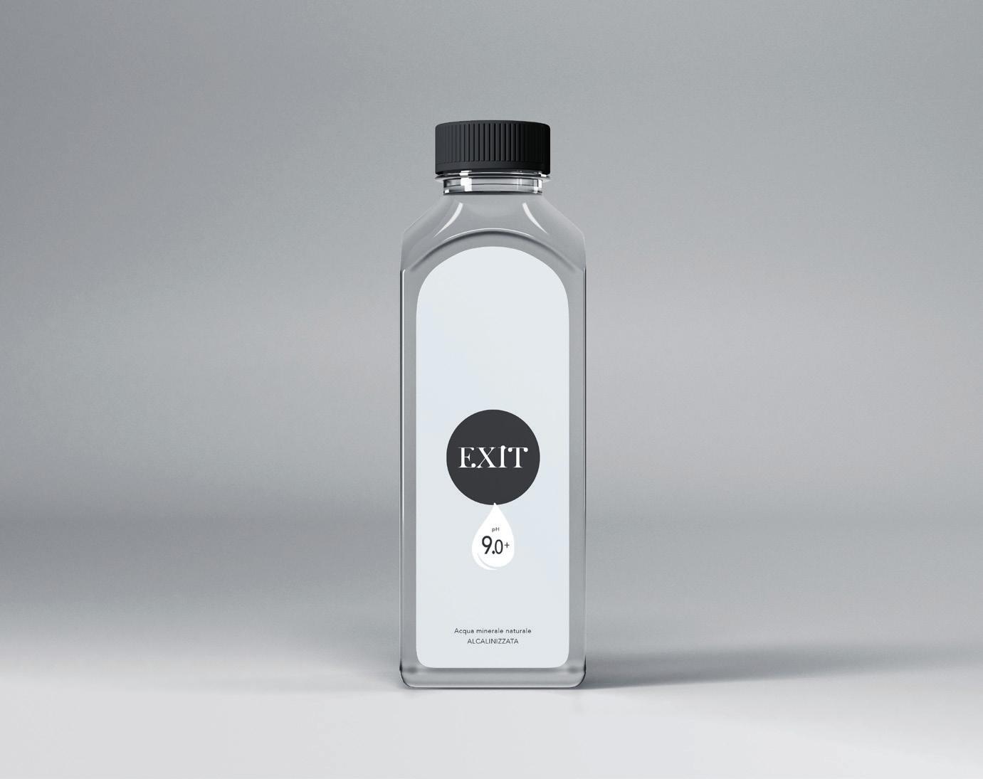 For the second bottle, I chose a more elongated and elegant glass shape, which upholds the brand’s minimalist ethos with a consistent label design. The EXIT logo and pH indication are prominently displayed, embodying the premium quality of the water.