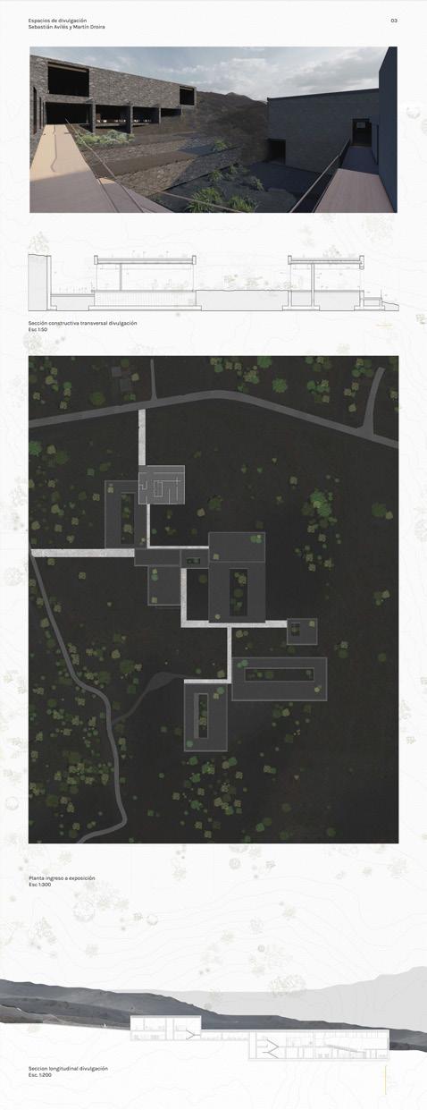 El propósito de este proyecto es desarrollar un complejo arquitectónico y paisajístico en La Palma que contemple diferentes áreas, como espacios para la investigación, divulgación y residencia para científcos que bajan en escalonada, integradas a la pendiente. Su objetivo es crear un modelo habitacional que pueda ser utilizado en situaciones de emergencia, junto con una infraestructura paisajística que permita apreciar y conocer el rico patrimonio medioambiental de la zona.