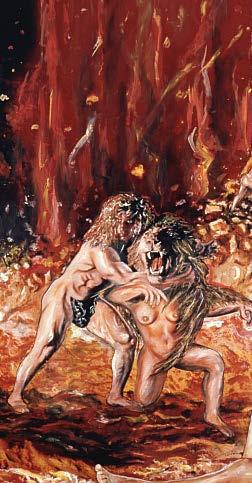 Klemm puede ser imaginado como un artesano, hacien do un trabajo de artesanía minúscula, un bricolage guia do por una mano que tiembla, una mano insegura pero que disfruta del montaje. Este modo de hacer puede ver se hasta en su propia casa, un teatrito doméstico para el deseo personal, donde el resultado es un relato grandi locuente, que aun así no deja de ser frágil. Lo narrativo simplemente era la excusa para contar cierta relación con lo inmediato. Su pintura, de trazos rápidos y grue sos, hace aún más visible su inscripción en la historia del arte. Esas imágenes se escondían bajo la mitología para no ser cuestionadas, para legitimarse en iconogra fías conocidas y pertenecer a una tradición. Por ejem plo, esas figuras de jóvenes corpulentos que derriban templos, santos rodeados por las llamas, cuerpos que emergen del Río de la Plata entre cristales y astros, una mitología muy propia.