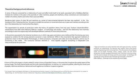 (manchinery) Research / artistic references Theoretical background and references A series of devices connected by a relationship of cause and effect lends itself to be easily associated with a Goldberg Machine. Instead, the machine in this piece is the assembly of other machines, people and interfaces; whose connections are more based on matters of content, rhythm and motion than cause and effect. Rendering daily scenes of urban life and machines as a series of interconnected elements has been also explored in the City Symphony Films. Following this line, this piece is divided into sections or movements that vary in pace and intensity according to the era in the relationship men-‐machine that they depict. The segmentation by periods of production within the history of capitalism (Henry Ford era/ post-‐ Fordism/ industrialism/Post-‐ industrialism] have been done following Deleuze´s analysis on technology and society; and how the relationship men-‐machines (accordingly to each era respectively) have developed different methods of control and production. In the sections associated to the industrial revolution era, in which cogs, gears and pistons were visible and their functioning was more exposed as evident; the link among elements (screens) is more mechanical. While in the movements that approach methods of production closer to the Information Technologies, in which processors, computers and codes are its key elements, and its way of functioning is less visible. The connection between elements is more digitally triggered. Everything is independent and interconnected at the same time. “ Types of machines are easily matched with each type of society-‐-‐not that machines are determining, but because they express those social forms capable of generating them and using them. The old societies of sovereignty made use of simple machines, levers, pulleys, clocks; but the recent disciplinary societies equipped themselves with machines involving energy, with the passive danger of entropy and the active danger of sabotage; the societies of control operate with machines of a third type, computers ” Gilles Deleuze -‐ Postscript on the societies of control (1992)