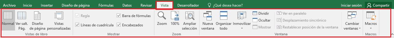 La ficha de menú Vista Excel es una barra horizontal que forma parte de la cinta de opciones de Excel y sirve para cambiar la forma de ver la hoja de trabajo,permite ver u ocultar las líneas de la cuadrícula que forman las celdas de la hoja de trabajo,además de ajustar el zoom del documento (acercar o alejar el contenido)