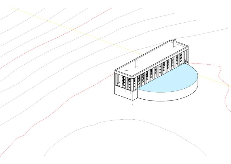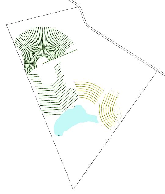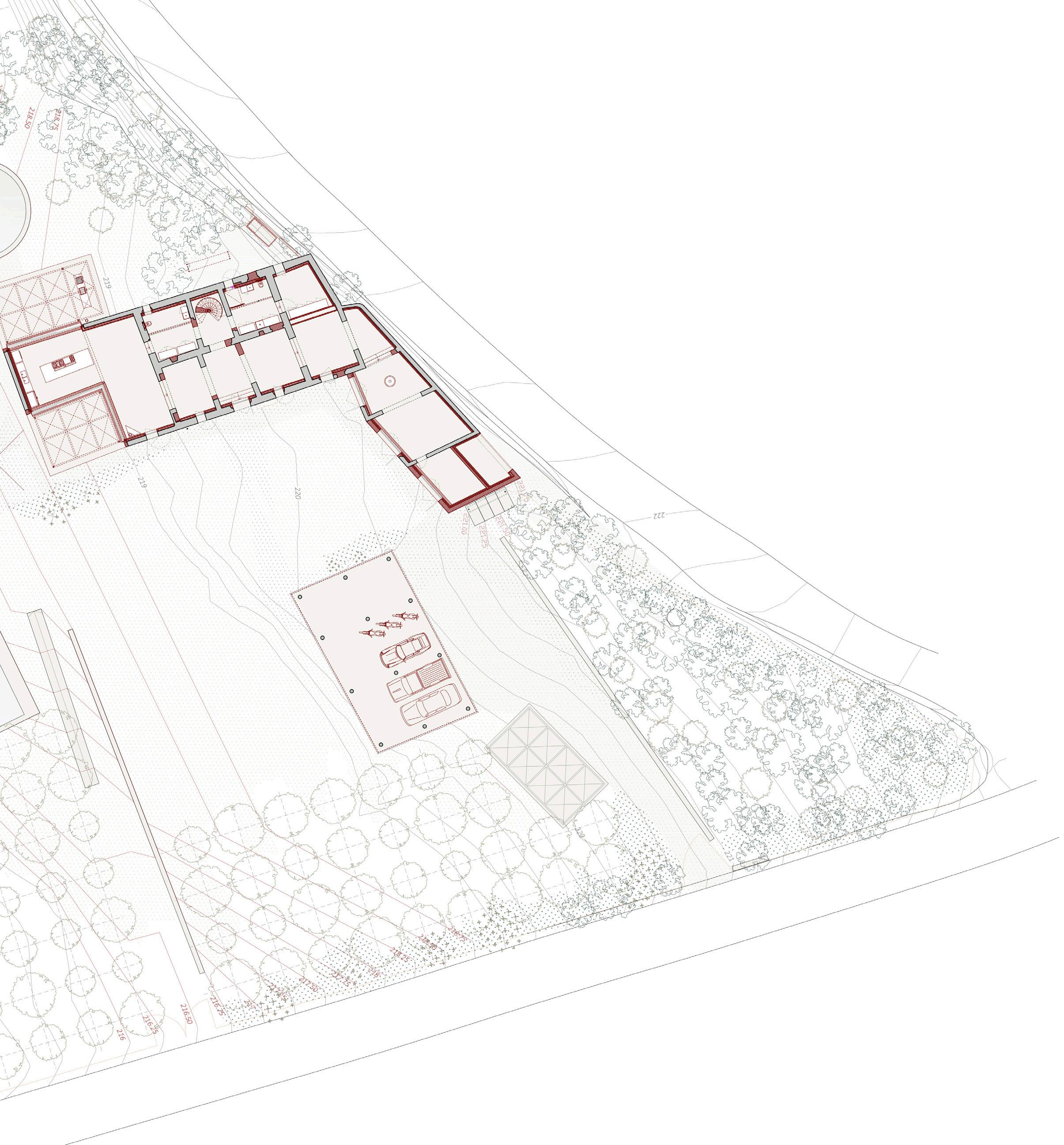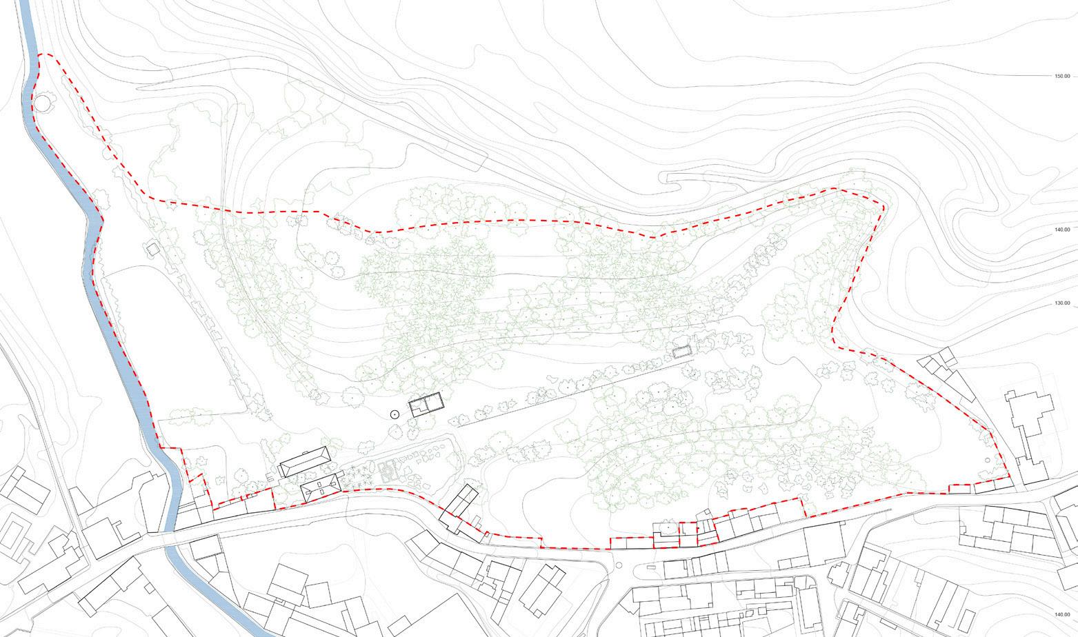 Planta de urbanización. Documentación ejecutiva. Por medio de la extensión del ala lateral de la masía y la disposición de arboledas y una piscina lineal, se genera un patio central contenido. Esta disposición en la suave inclinación del terreno garantiza las vistas hacia el agua y hacia las copas de los árboles. Por medio de muros de contención bajos y rampas se procuran espacios de estar y de recorrido por la parcela. El fuelle hacia la calle se resuelve mediante un bosque de especies autóctonas.