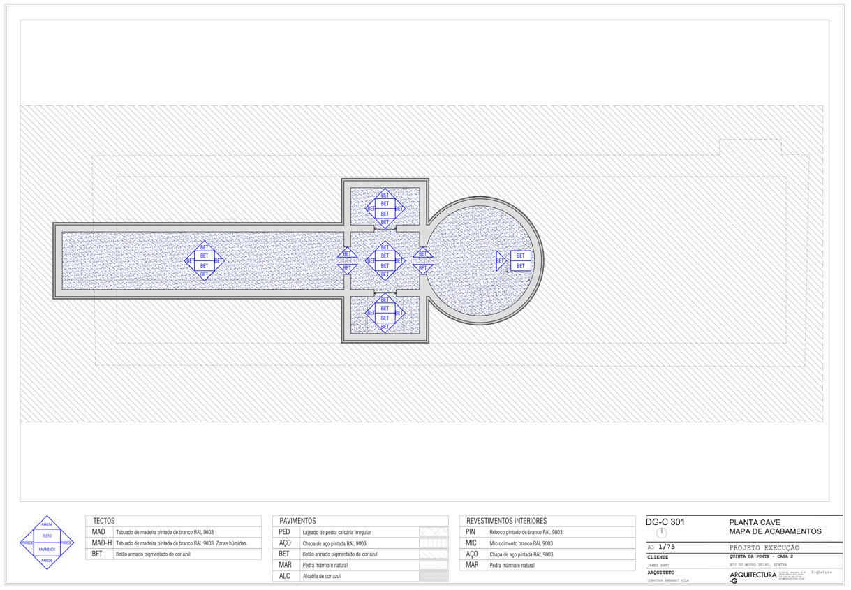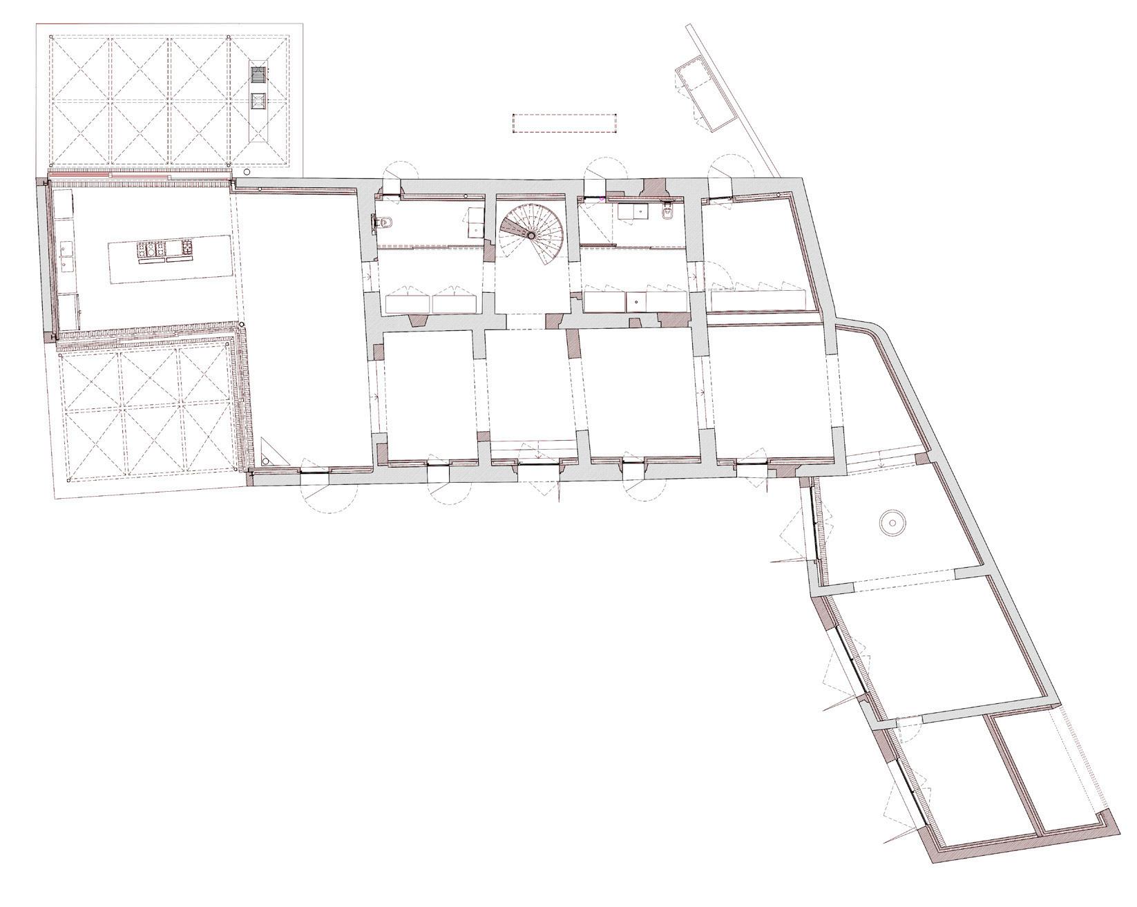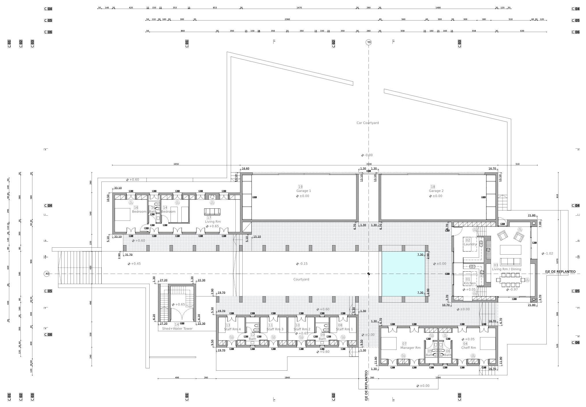 Planta de urbanización. Documentación ejecutiva. Por medio de la extensión del ala lateral de la masía y la disposición de arboledas y una piscina lineal, se genera un patio central contenido. Esta disposición en la suave inclinación del terreno garantiza las vistas hacia el agua y hacia las copas de los árboles. Por medio de muros de contención bajos y rampas se procuran espacios de estar y de recorrido por la parcela. El fuelle hacia la calle se resuelve mediante un bosque de especies autóctonas.