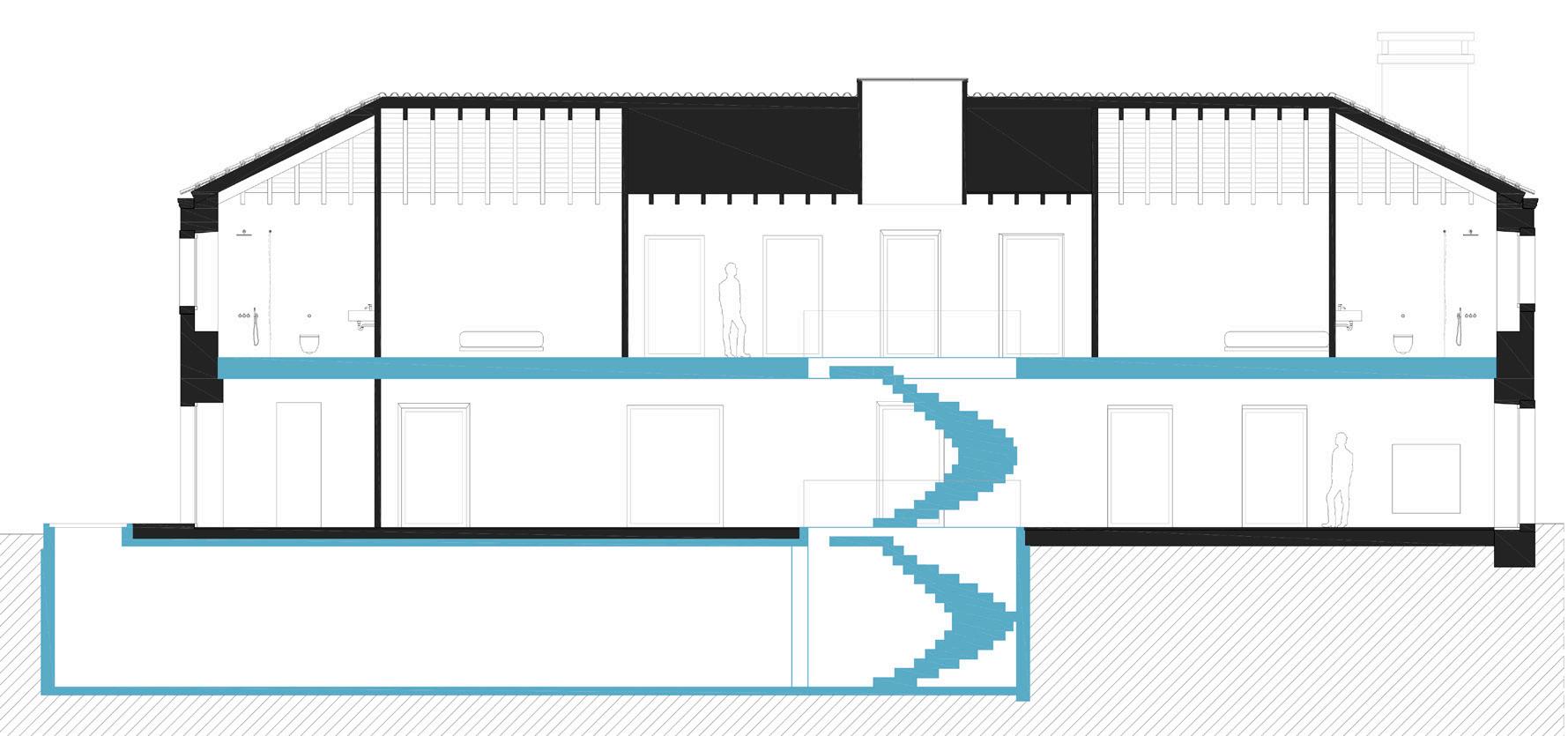 Detalle constructivo. Fundaciones y forjado nuevo. Debido a la escasa altura de la planta baja existente se decide realizar un rebaje a la solera. Para esto, se deberá ejecutar un recalce del perímetro estructural completo, a desarrollarse en tramos de 1 metro a fin de sostener la masía. La excavación total suma 1.40 metros de profundidad respecto de la cota interior actual, margen necesario para construir una cámara sanitaria necesaria para la ventilación de humedades y el paso de todas las instalaciones.