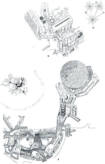 Grupo “Archigram” (jefe del grupo: Theo Crosby) . Proyecto para un centro de actividades comerciales en Montreal, 1964