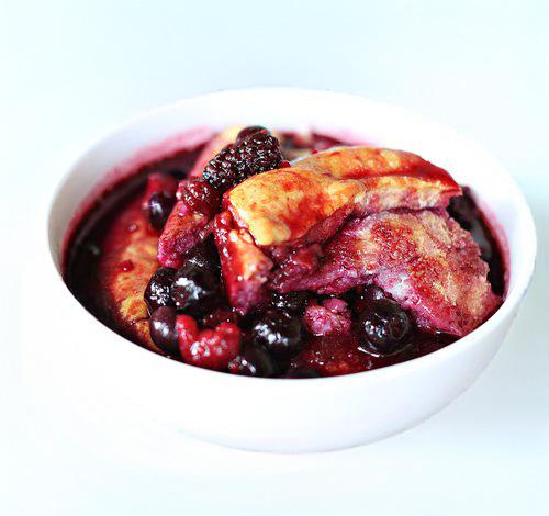 Pour batter into a deep baking dish; spoon fruit over top (don’t stir).