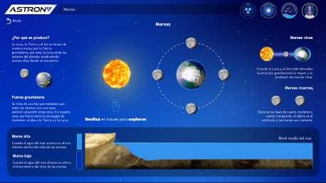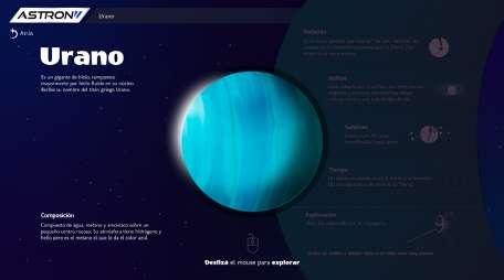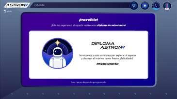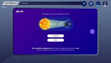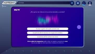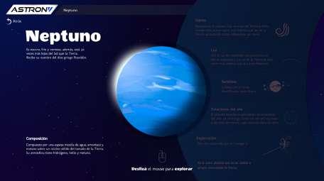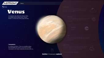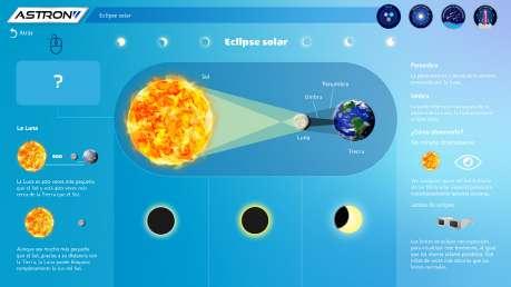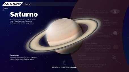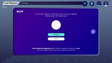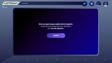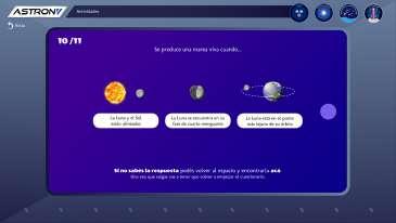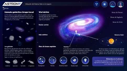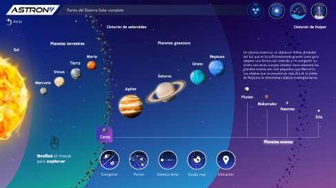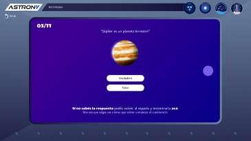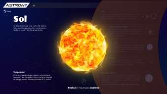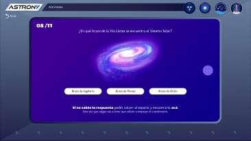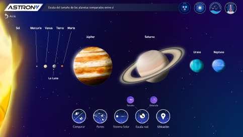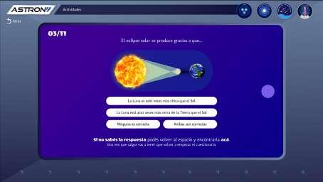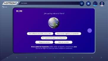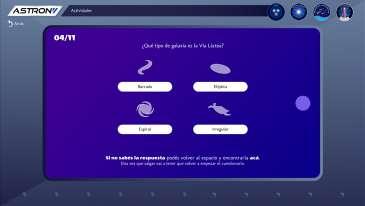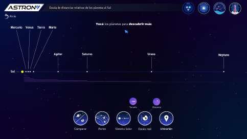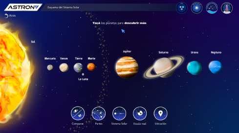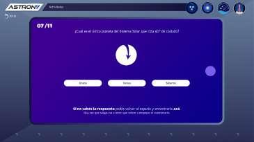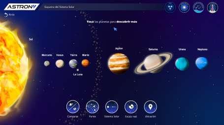 Se presenta una en la que el alumno viaja a través del espacio, mostrando en la pantalla principal una ventana hacia los planetas, luego una visión más cercana a estos en el Sistema Solar y, de vuelta en la nave, en la sección “Actividades” una pantalla dentro de la misma para responder preguntas.