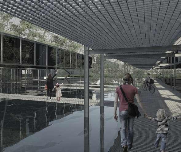 El proyecto transforma al sector en un innovador distrito productivo, concentrando el desarrollo de actividades intensivas en conocimiento. Un planteo compacto, diverso y equilibrado en el que los espacios productivos conviven con los nuevos modos de vivir. Los equipamientos y las zonas de descanso verdes, conforman un gran foro cultural y tecnológico, que relaciona pasado presente y futuro, interactuando con el tejido existente y generando vínculos de conexión entre los grandes equipamientos urbanos circundantes.