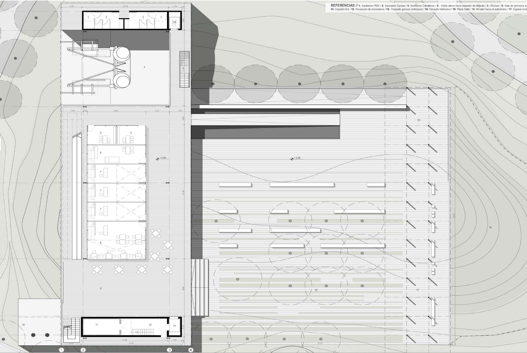 Frente a la propuesta de extender la línea del teleférico San Bernardo al Cerro Delta, el proyecto propone la estación motriz de llegada ubicada según lo establecido en las bases, formando parte de una organización espacial compacta lineal que permite volcar el programa hacia las mejores visuales del Cerro. Como estrategia de implantación se propone una plaza de llegada peatonal que simplifica la accesibilidad de los distintos puntos propuestos en el parque temático y enlaza al edificio a través de dos rampas que unen los miradores con vistas panorámicas a todo el paisaje natural y al autódromo de la ciudad.