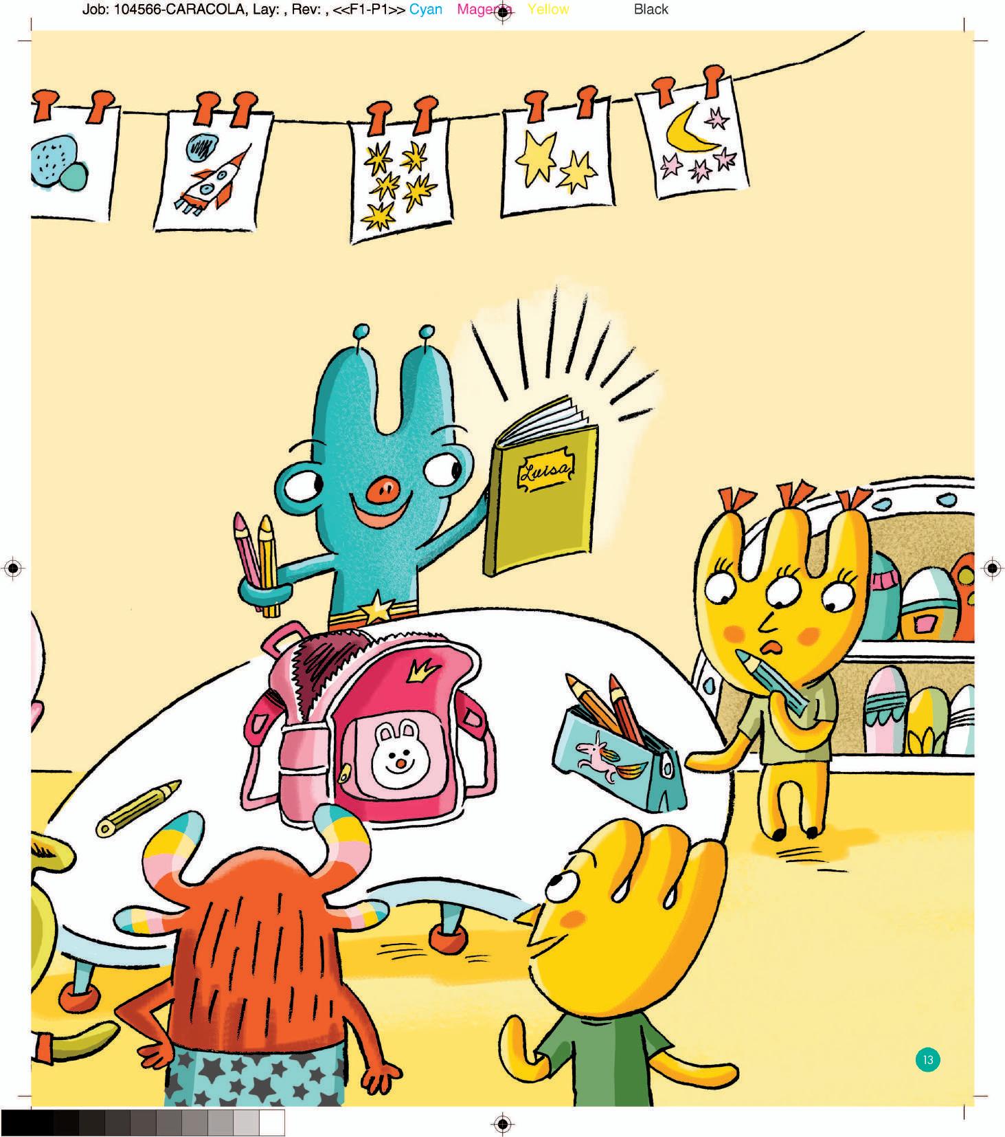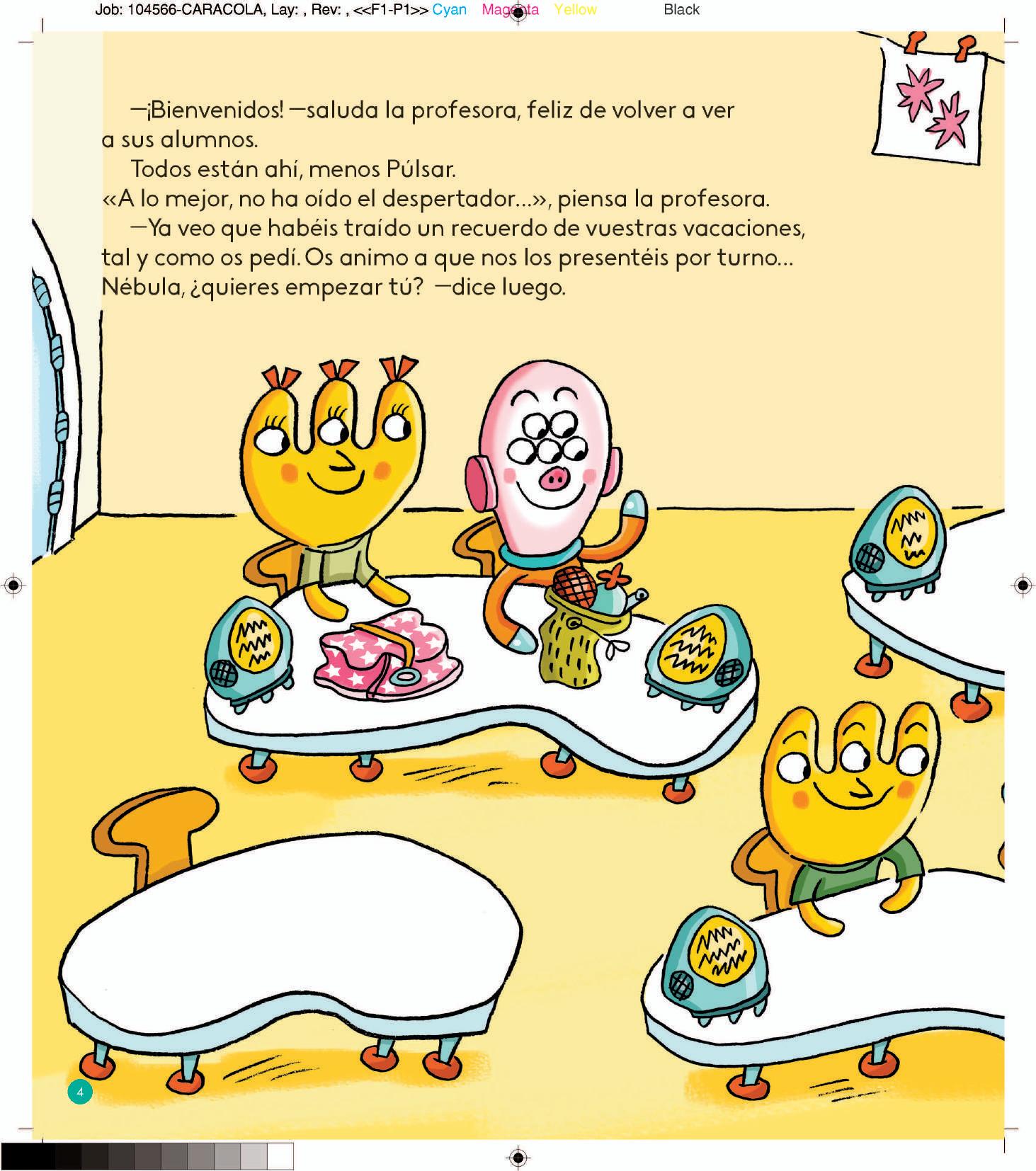 El primer día de clase, en un cole extraterrestre, los alumnos traen recuerdos de sus vacaciones: un instrumento de música para bailar, un perfume asqueroso, una concha para escuchar el silencio, una camiseta… y una mochila del planeta Tierra, que una niña terrestre busca desesperada… ¿Los extraterrestres se la devolverán?