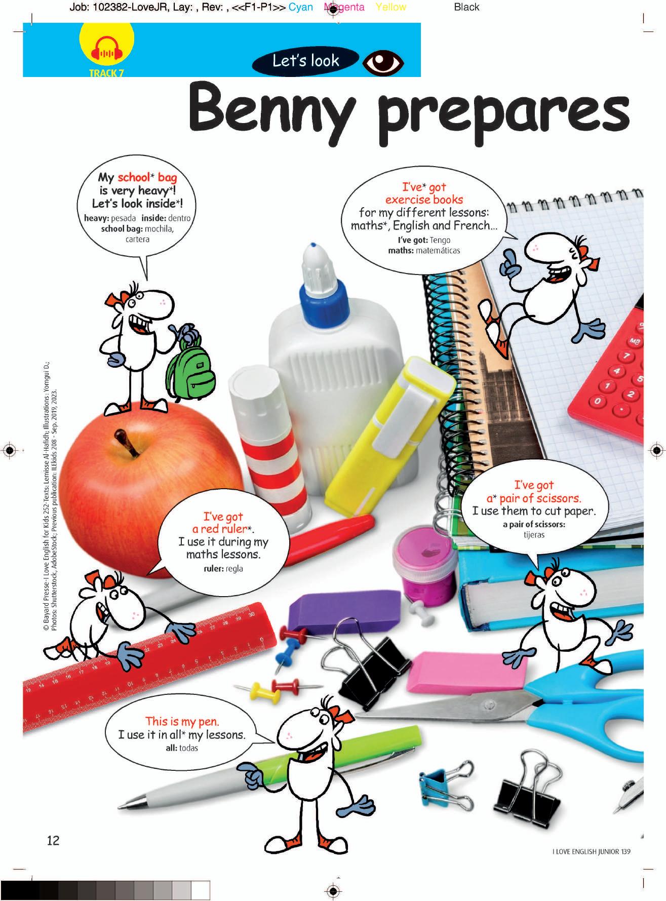 © I LOVE ENGLISH FOR KIDS. Bayard Presse. Directora de la Prensa Juvenil: Nathalie Becht. Redactora Jefa: Lemisse Al-Hafidh. Director de Arte: Martin Fonquernie. Secretario General de la Redacción: Julien Vonthron. Primera Secretaria de Re dacción: Mary Cummings. Primer Redactor Gráfico: Pierre Hovnanian. Directora de fotografía: Isabelle Rouvillois. Asistente de Redacción: Mariama Camara. Todas las ilustraciones “Benny” son de Yomgui D.