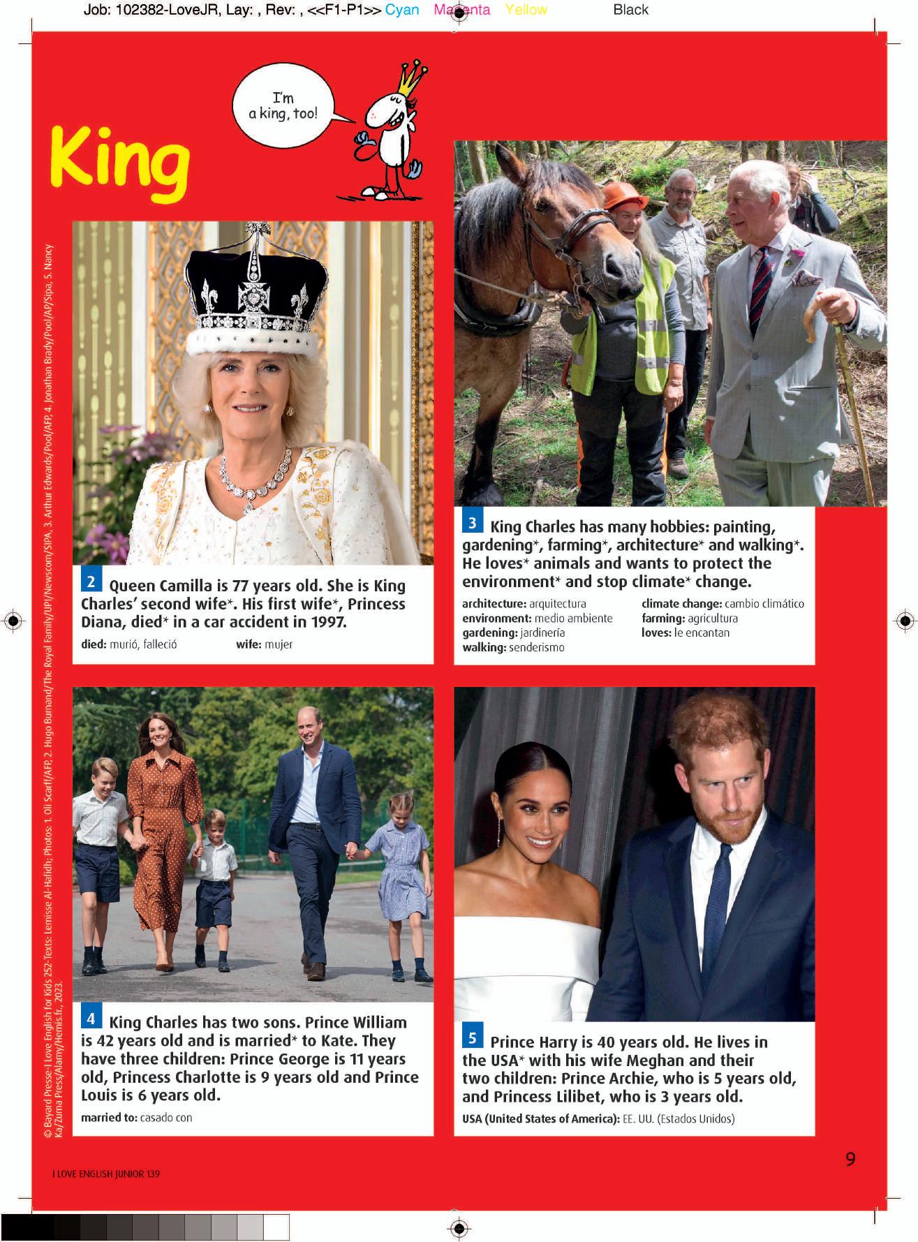 Page 6. Game 1. You can jump really high! Game 2. a-jump, b-squirrel, c-hazelnuts, d-trampoline. Game 3. I can see sixteen hazelnuts. Game 4. Trampolining is very easy! Game 5. Are you hiding under the trampoline? Game 6. I’ve got some hazelnuts for you! Page 10. Game 1. Charles and Camilla are king and queen. Game 2. There are nineteen diamonds, five red rubies, thirteen green emeralds, sixteen blue sapphires. Game 3. Running. Game 4. Harry; William. Pages 14-15. Game 1. This is my teacher, Mrs Smith. Game 2. I’ve got seven pencils. I’ve got one pencil case. I’ve got four pens. I’ve got nine books. I’ve got two rulers. I’ve got five rubbers. Game 3. I want a blue calculator. Game 4. Do you like school? Game 5. A blue pen. A green pencil case. A red school bag. A yellow glue stick. A pink rubber. An orange pencil sharpener. Page 18. Game 1. I like to go for walks every day. Game 2. I am calm, gentle and affectionate.