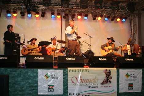Foi com este espírito de entusiasmo que hipotecamos todo apoio do governo local aos organizadores do Fes val, para que o Sinuelo da Canção Na va, desde seu 1º Aparte, assumisse papel de protagonista no ambiente na vista do Rio Grande, antevendo que se transformaria no encontro de grandes compositores e intérpretesacadaedição.