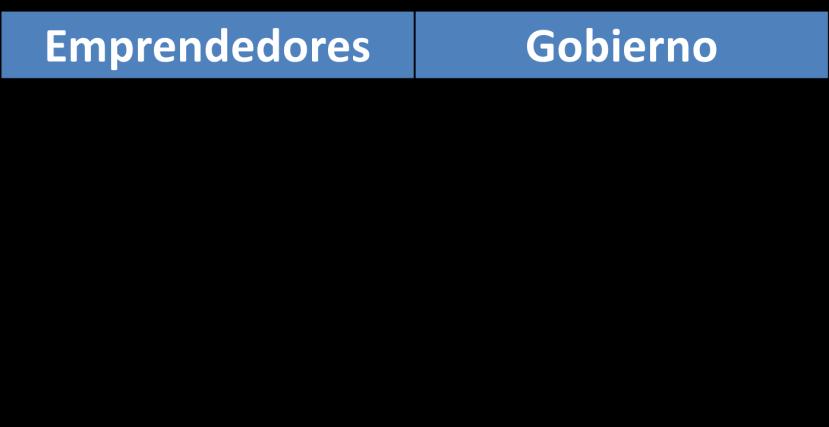 Mientras que los/as emprendedores/as e innovadores/as tienen un enfoque autocentrado, el gobierno asume una visión global, de conjunto. Los/as emprendedores/as e innovadores/as impulsan iniciativas de-abajohaciaarriba (bottom-up) mientras que el gobierno propone de-arriba-hacia-abajo (top-down). Los/as emprendedores/as e innovadores/as mantienen su atención centrada en aspectos micro, y el gobierno mantiene su atención centrada en aspectos macro. Los/as emprendedores/as e innovadores/as son propensos a la acción, y los gobiernos a la instrumentación de planes