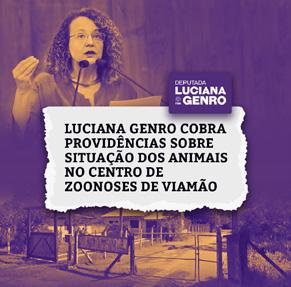 Após receber denúncias sobre as péssimas condições nas quais vivem os animais do Centro de Zooneses de Viamão, Luciana Genro acionou o Ministério Público, que está investigando a situação. A deputada solicitou que o MP avalie se a prefeitura não estaria praticando crime de maus tratos aos animais, após uma série de denúncias de protetores relatarem uma situação desesperadora, com animais que seriam jogados lá sem nenhum tipo de cuidado. Depois de ser notificada pelo MP, a Secretaria de Saúde de Viamão reconheceu que a estrutura era arcaica e ultrapassada, montada há muito tempo, não atendendo mais ao que era proposto. Luciana Genro baseou a denúncia ao MP em diversos relatos de protetores de animais, que apontavam inclusive que um cachorro já teria ficado cego por falta de tratamento no local. Em resposta ao MP, a prefeitura informou que realizou uma força-tarefa com protetores e os animais que estavam no local foram ressocializados e doados. Garan-