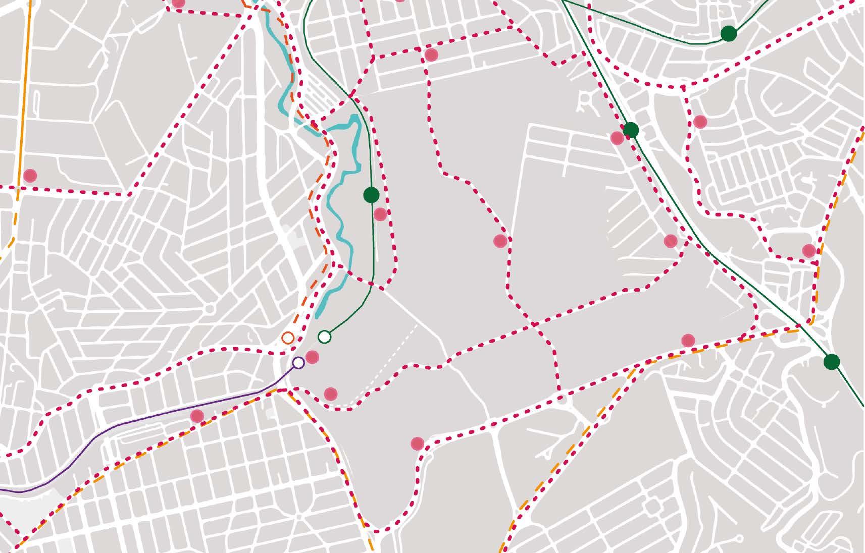 Identificou-se que a área ocupada pela siderúrgica Mannesmann encontrava-se subutilizada e atuava como uma barreira no local, impedindo o fluxo de pessoas e também agravando a questão socioambiental. A partir disso, e considerando a retirada da empresa do local, propôs-se a requalificação dessa área. Uma das premissas fundamentais foi a preservação dos chamados “territórios ambientais”, que são regiões de vegetação preexistente, em que há nascentes, cursos d’água e matas ciliares, cuja preservação possui grande importância para a saúde o bem-estar da comunidade. Implantou-se em ponto estratégico da área uma tríade de modais: estação de trem CBTU, estação de VLT e estação de BRT. Além disso, propôs-se o estabelecimento de equipamentos urbanos como instituição de ensino e mercado distrital, a fim de fortalecer a nova centralidade e fomentar o desenvolvimento econômico da região.