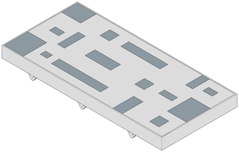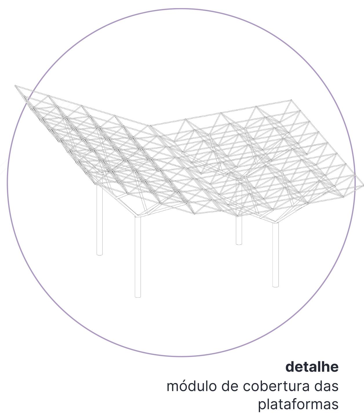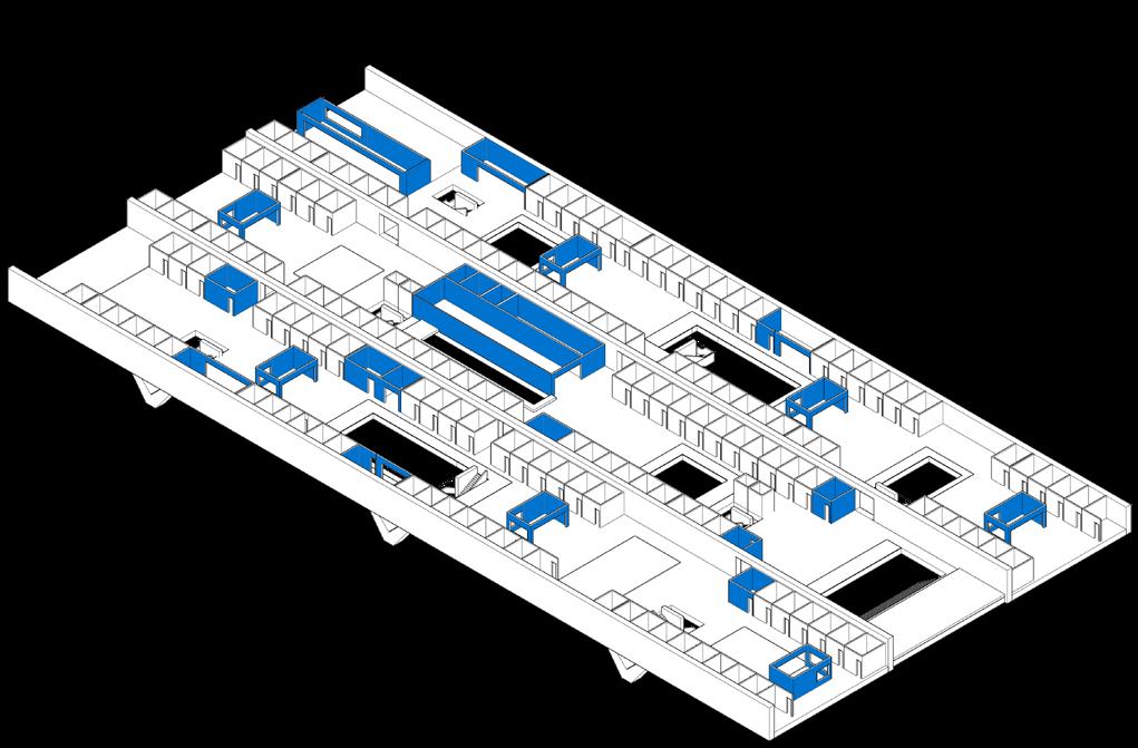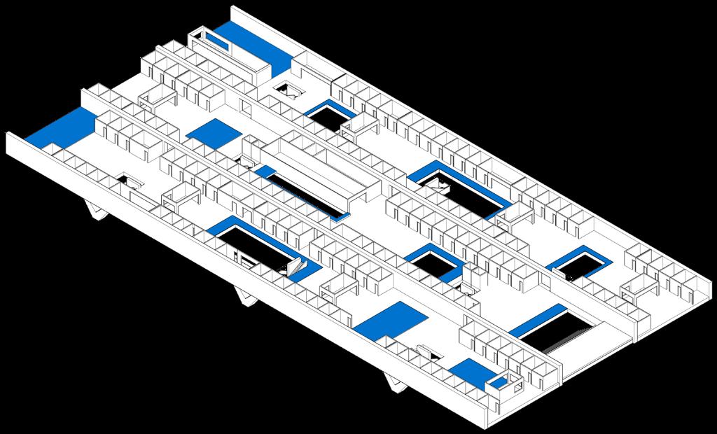 Este exercício projetual propõe a radicalização do conceito de caixa habitável, dispondo lado a lado o equivalente a três edifícios do Museu da Civilização Brasileira, totalizando 24 mil m2, distribuídos entre os dois pavimentos. Essa ação, associada ao uso híbrido, moradia universitária e serviços, amplia a urbanidade e a independência da caixa elevada, mas mantém a interação com o pilotis através de aberturas que comunicam com o primeiro e segundo pavimentos. A fim de reforçar a forma pura do edifício, as aberturas necessárias à iluminação e ventilação são feitas zenitalmente variando em escala e posição, promovendo uma ambiência diferente em cada ponto do prédio.