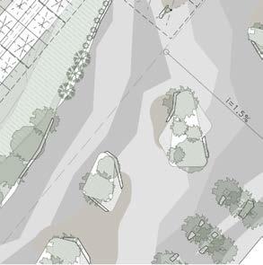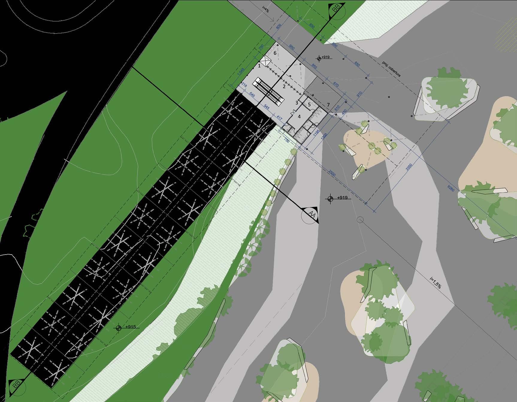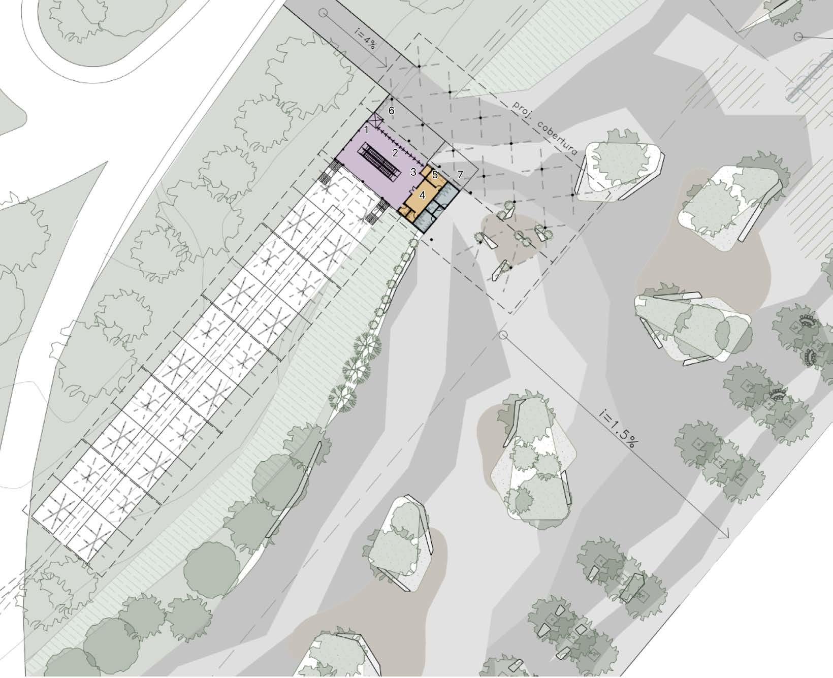 O plano urbano que consolida todos os modais do projeto apresenta diversos espaços de fruição pública. A rua de pedestre, por sua vez, é responsável por conectar a porção mais elevada do terreno da Mannesman à outra extremidade em menor nível, para onde estão previstas as edificações de uso misto. Esta rua-praça é escalonada em níveis de rampas e escadas, sendo proposto por fim a utilização do seu espaço inferior para docas que servem de apoio ao Mercado Distrital.