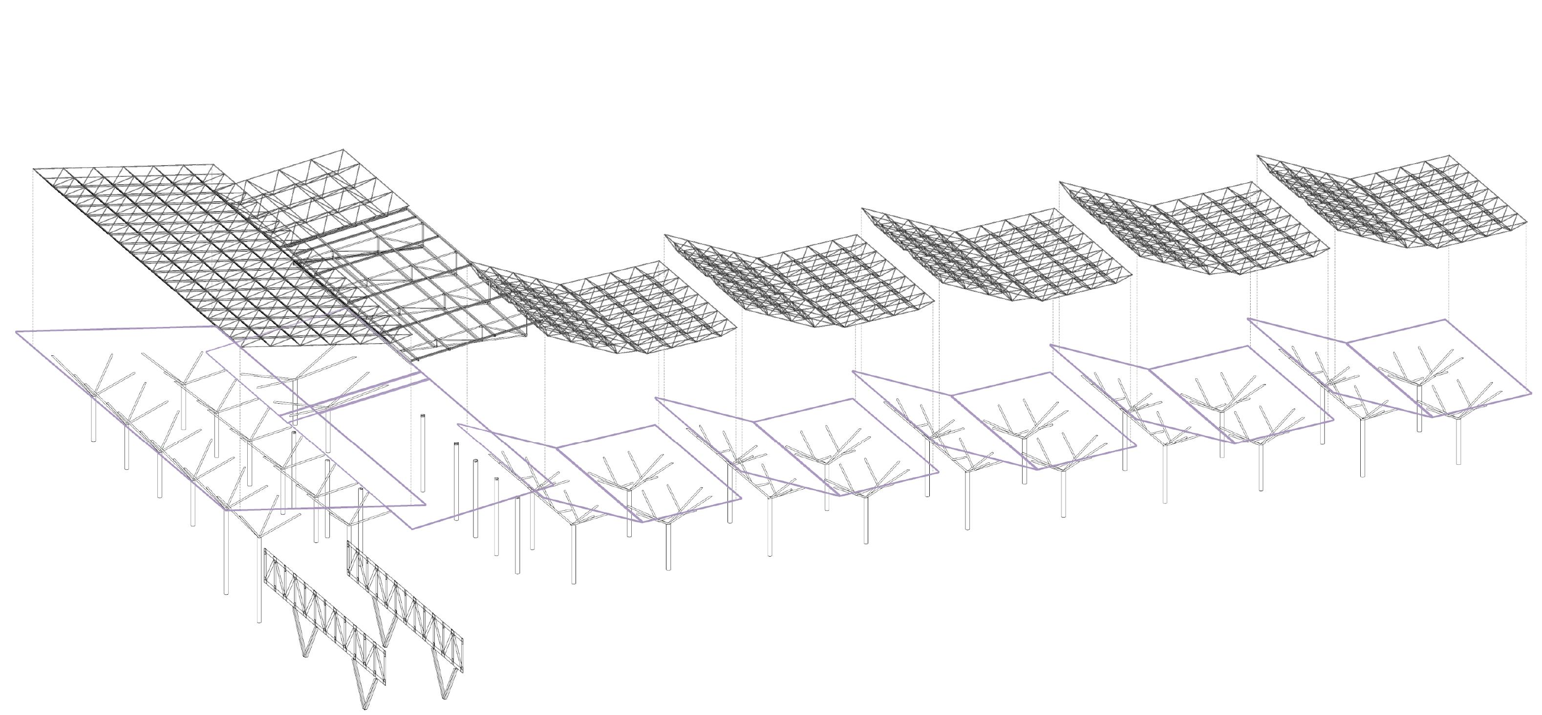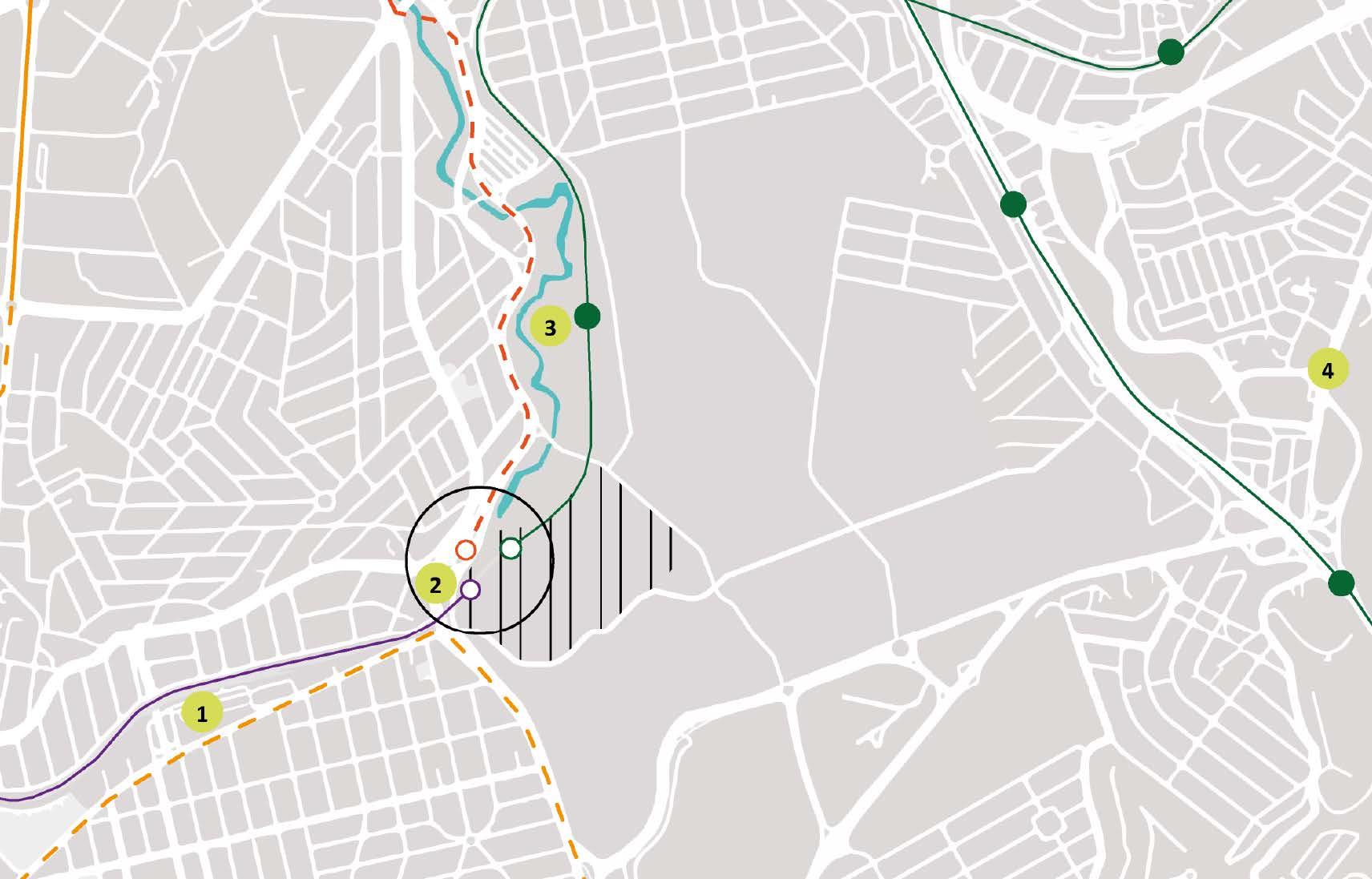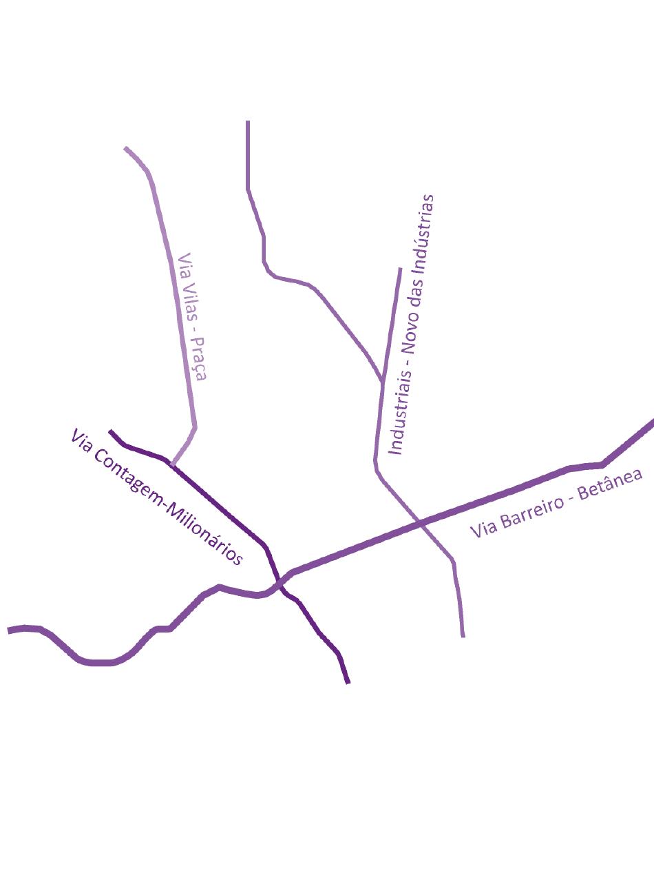 Companhia Siderúrgica Mannesmann, localizada no Barreiro, divisa com o município de Contagem. Como parte da proposta, pretende-se implementar uma tríade de modais, que cumpre o papel de fortalecer as centralidades locais e articulá-las ao contexto urbano e metropolitano. Um conjunto de hipóteses interescalares foi produzido a fim de elucidar a possibilidade de implantar na área um trecho da linha 2 de trens da CBTU, ampliar a Conexão SIM Contagem e implementar duas linhas de VLT. Para isso, apropriar-se-á de uma linha férrea previamente existente, cujo traçado servirá de suporte para a linha de trem e também para a linha de VLT. Seguindo essa estratégia, gerou-se um grande concentrador de equipamentos de mobilidade, denominado “Tríade de Modais” a partir da qual foram instalados equipamentos urbanos que desempenham importantes funções no contexto local: um Mercado Distrital, quadras poliesportivas e campo de futebol comunitários, além de um campus de Instituição de Ensino Pública. A inclusão de equipamentos urbanos enriquecerá a vida dos moradores e visitantes, tornando a Estação Viaduto das Artes um destino importante em uma cidade em constante evolução, além de promover a educação, a prática esportiva, a cultura e o desenvolvimento econômico. A ampliação do BRT e a implementação de VLT’s representam um compromisso com práticas ecológicas de gestão e acessibilidade, tornando este um projeto uma alternativa viável para o contexto regional em que se insere.