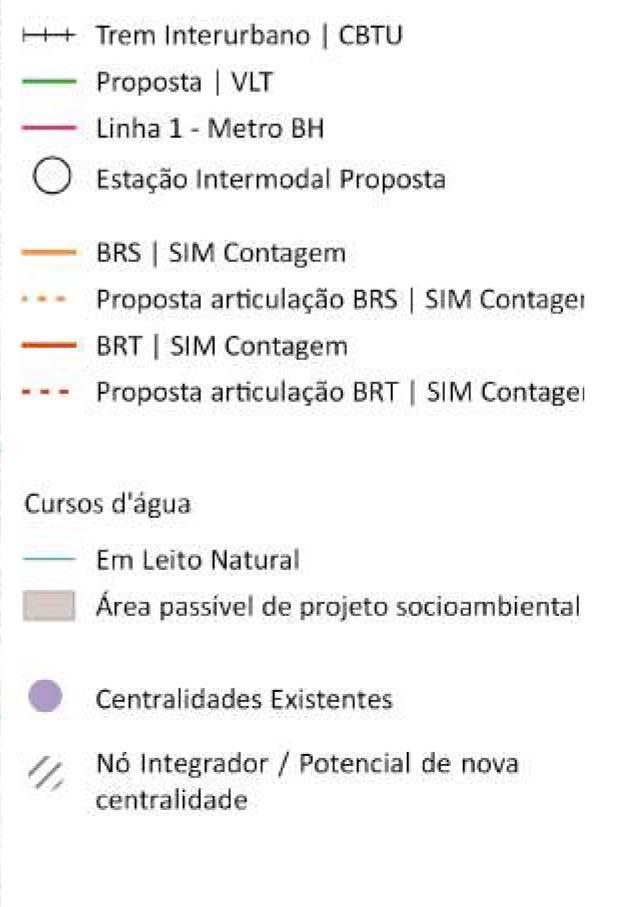 Tomando como ponto de partida a identificação de centralidades regionais, em particular as regiões do Eldorado, Barreiro e Cidade Industrial, elaborou-se um plano de mobilidade que fosse capaz de articular essas localidades entre si, por meio da criação de uma nova centralidade. Aposta-se na implementação das novas linhas de transporte público coletivo: do trem de passageiros da CBTU, do VLT, BRS e BRT SIM Contagem. Todos esses modais se encontram em um mesmo ponto: na região da antiga Mannesmann, onde são constituídos um nó integrador e equipamentos urbanos. Além disso, optou-se por manter o Ribeirão Arrudas em leito natural durante todo o trajeto que margeia a porção oeste da área da antiga Mannesmann.