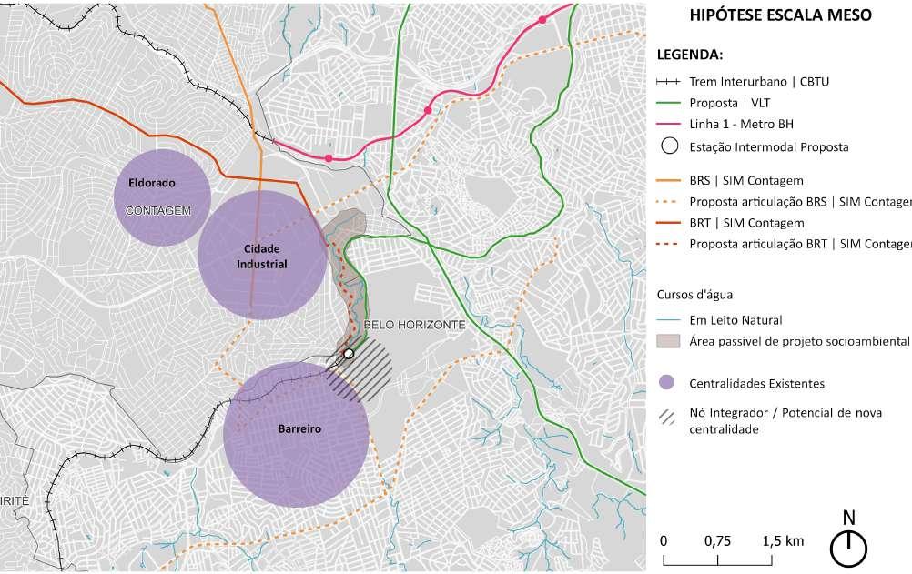 A partir da identificação de centralidades regionais, em particular as regiões do Eldorado, Barreiro e Cidade Industrial, elaborou-se um plano de mobilidade que fosse capaz de articular essas localidades entre si. Apostando na implementação das novas linhas de transporte público coletivo: do trem de passageiros da CBTU, do VLT, BRS e BRT SIM Contagem. Todos esses modais se encontram em um mesmo ponto: na região da antiga Mannesmann, onde é constituído um nó integrador e equipamentos urbanos com potencial de gerar uma nova centralidade. Por sua vez, as vias de integração regional que foram adicionadas à malha urbana da região ficam responsáveis