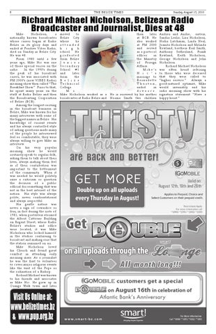 then later at BCB. He also worked at FM 2000 and ser ved as a protocol officer in the Ministr y of Foreign Affairs. M ike’s N i c ’ s mar riage to Bernadette Thurton, ended in d i vo r c e. He is sur vived by his mother Nor ma Smith two children