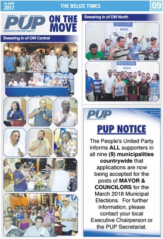 PUP NOTICE The People's United Party informs ALL supporters in all nine (9) municipalities countrywide that applications are now being accepted for the posts of MAYOR & COUNCILORS for the March 2018 Municipal Elections. For further information, please contact your local Executive Chairperson or the PUP Secretariat.
