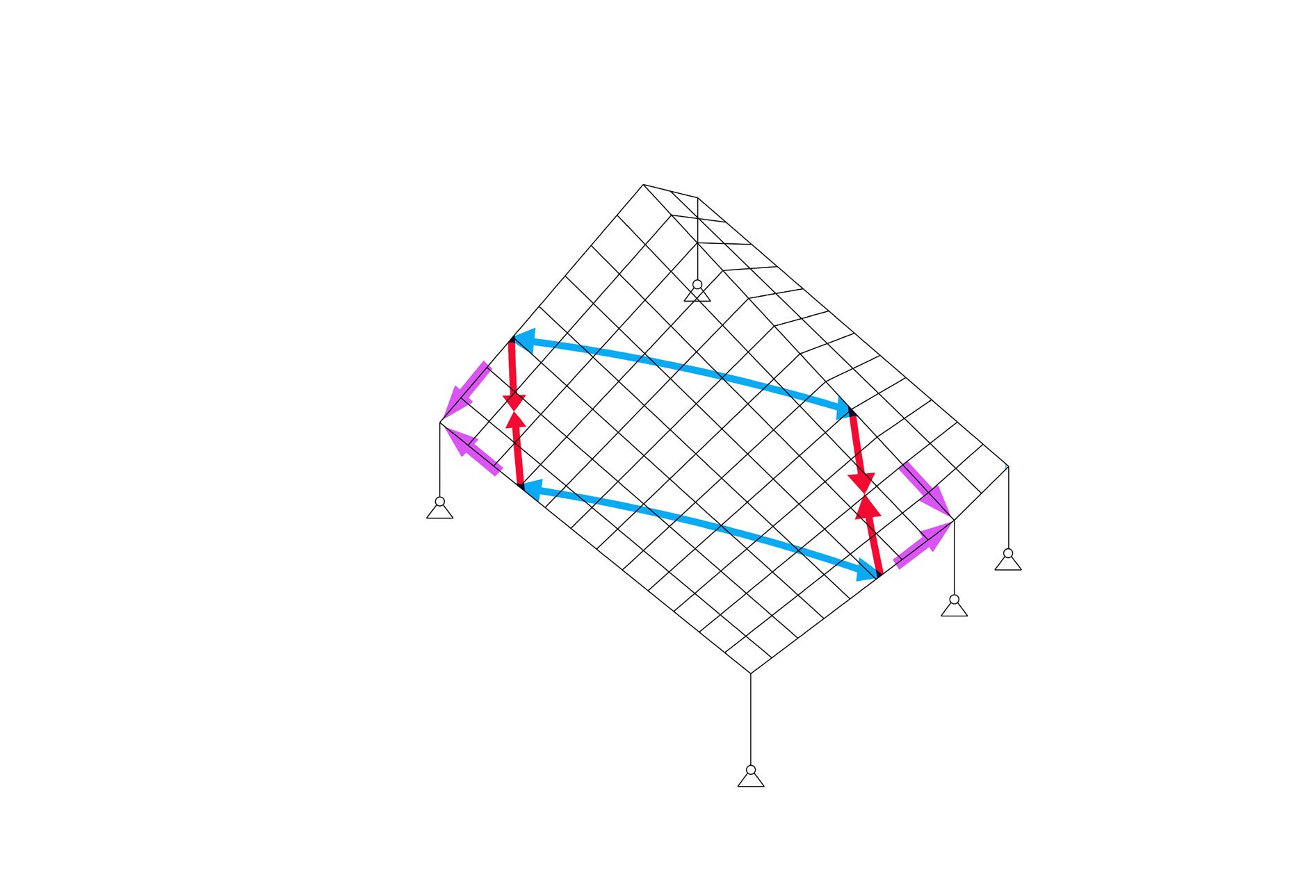 In the case of the hyperbolic paraboloid, the tensile forces occur in one direction and the compressive forces in the other. The support takes place in two opposite corner points, so the rigidity of the construction depends on the difference in height of the corners.