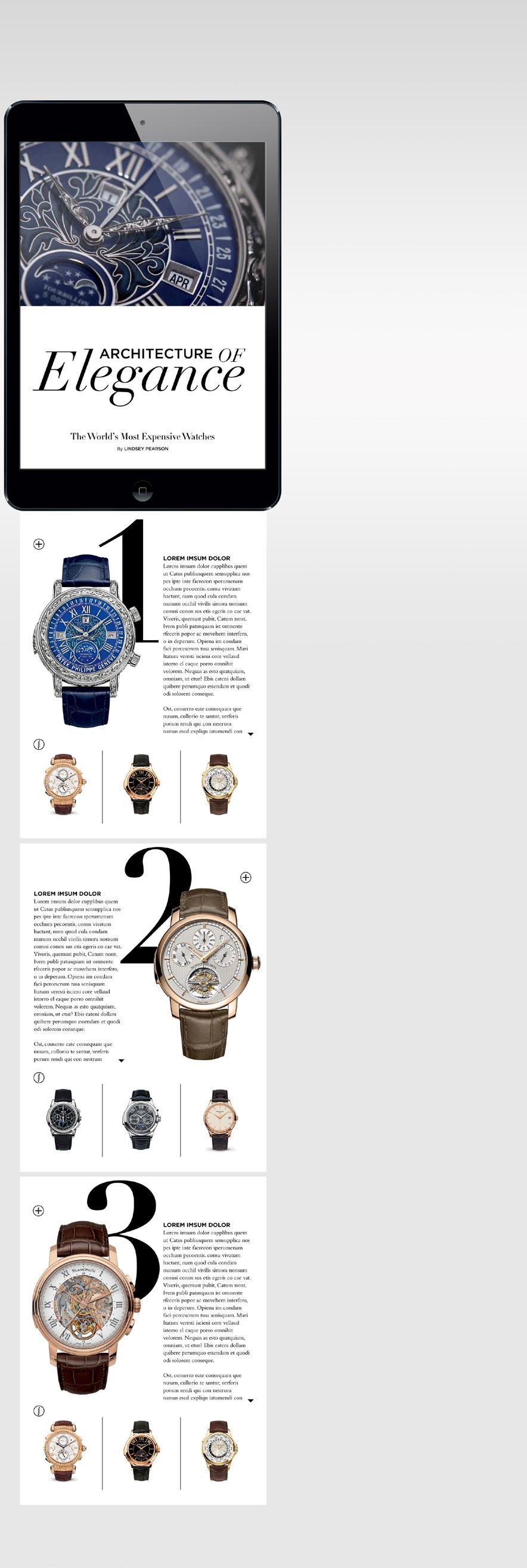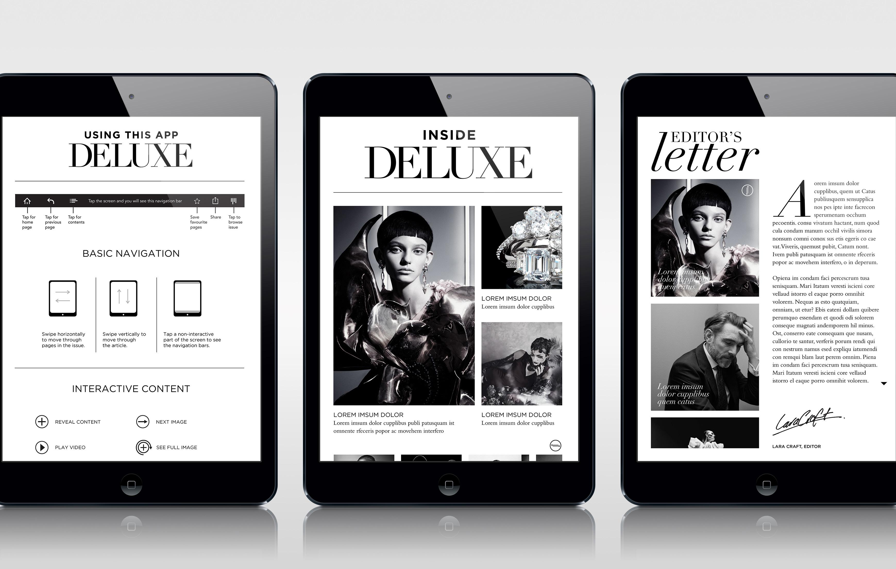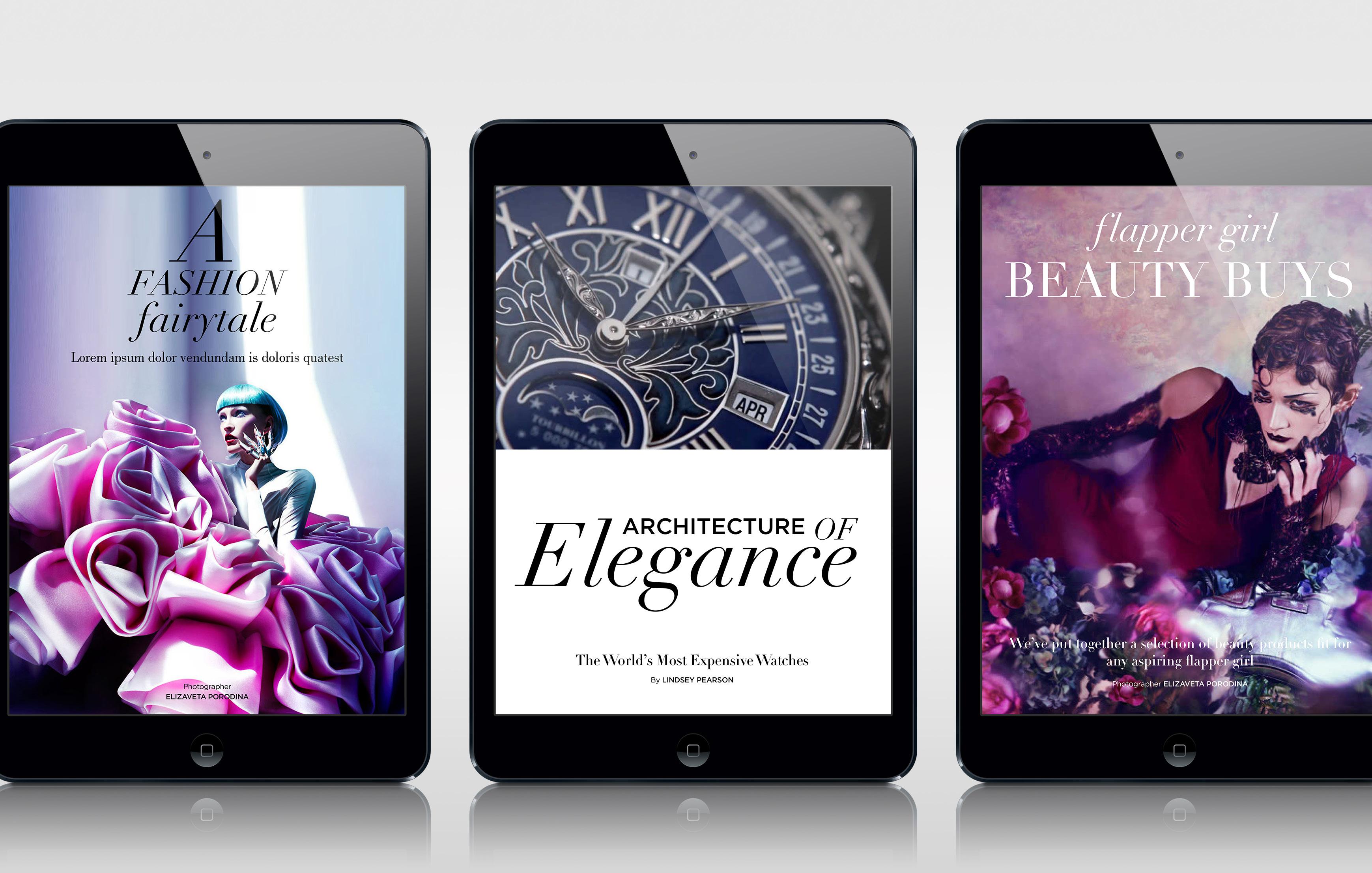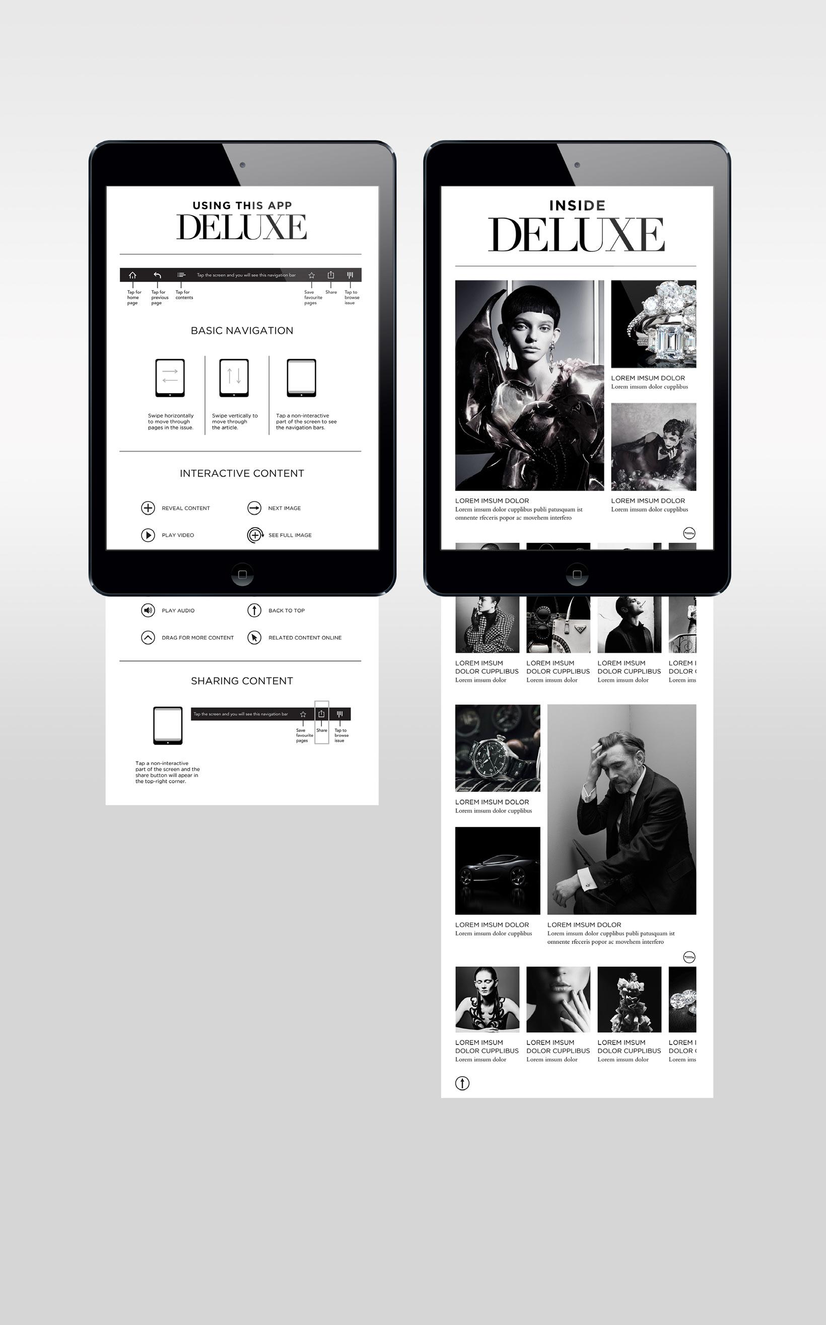 The brief for this project was to anticipate the future development in digital publishing by creating a luxury digital magazine prototype. The targeted audience was predominantly higher-income readers, women and men, with a sensible women predominance, well connected to the present world and using digital devices.