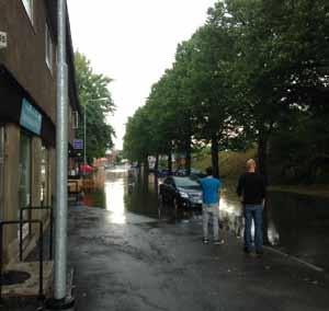 Skyfallen i Karis var av sällan skådat slag. Hela centrum låg under vatten. Fotografiet ovan är taget i hörnet av Bangatan och Dalgatan, det andra längs Bangatan. Foton: Emilie Nordström