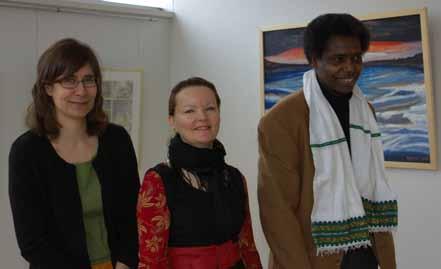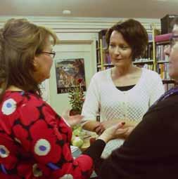 Jenni Haukios besök: På bilden samtalar Jenni Haukio med bibliotekarie Diana Turunen (till vänster) och Gungerd Wikholm om vikten av de små biblioteken och att Turunen skapat ett bra utbud med bland annat författarträffar, skolbesök, sagostunder och läsekretsar. Foto: Kerstin Niemi