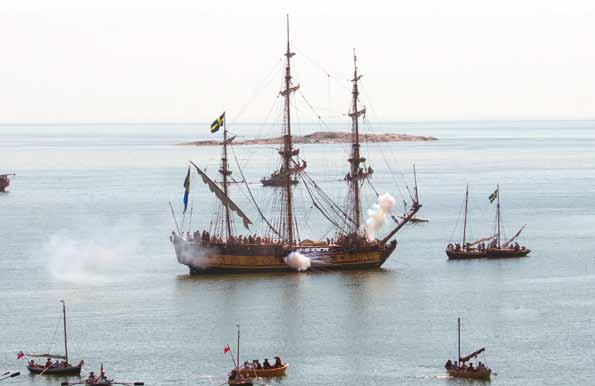 Hur det kunnat komma fram mellan holmarna visste ingen berätta. Ankarvinschen hade gått innan fiskarna gett sig ut till bragderna vid soluppgången. Och när byfolket uppe på bondlandet tog cyklarna ur lidren och med korgar och kassar trampade neråt kyrkbyn efter lördagsströmmingen, fanns det inte längre över skogsholmarna i söder ens en rök, som röjde närvaron av det stora fartyget.” (ss. 179–180).