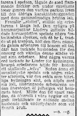 ”Från Svartå skrifves till oss” berättar: ”för en tid sedan hade kammarjunkar Hj. Linder sammankallat fabriksarbetarna till brukets läsesal, där han tillkännagaf sin afsikt att minska arbetstiden till åtta timmar om dagen. Denna förändring kunde dock ej genast genomföras, utan först efter 1½ år, enär ett ökadt antal arbetare blir en följd af densamma, hvarför nya arb. bostäder först måste uppföras”.