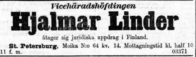 Därefter tjänstgjorde Hjalmar Linder under ett par perioder som häradshövding vid domsagan i Ikalis. År 1889 tilldelades han titeln vicehäradshövding och antogs som extra tjänsteman vid kejsarens kansli och statssekretariatet för Finland. I Sankt Petersburg öppnade den flitiga juristen en advokatbyrå. Annonser om verksamheten fanns i Nya Pressen och Uusi Suometar under åren 1889–90.