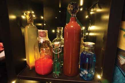 I Upplevelserummet på Hangö Stadsbibliotek bygger jag varje år upp en ny läs- och fantasistimulerande miljö. Omgivningen hjälper barnen att koncentrera sig och fokusera, att nästan konkret kunna stiga in i böckerna och berättelserna. Rummet byggs upp av tyger, lampor, träd, känslo-och konkretiseringsflaskor. Många spännande och udda föremål har jag hämtat hemifrån, köpt på loppmarknad eller lånat. Åhörarna får aldrig röra grejerna, de belyses endast med ficklampa för att höja den magiska stämningen. Till förberedelserna inför upplevelsestunden hör ingångsrutiner med ”tystnadsstenar”, innan själva programmet kan börja.
