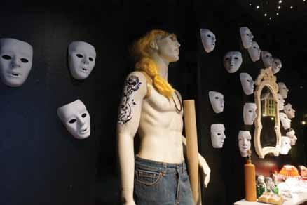 Vem vill jag vara? Vem vill jag visa att jag är? Vem är jag? Skyltdockan är detta år en ung man med tatueringar. På väggen bredvik finns många olika ansiktsmasker.