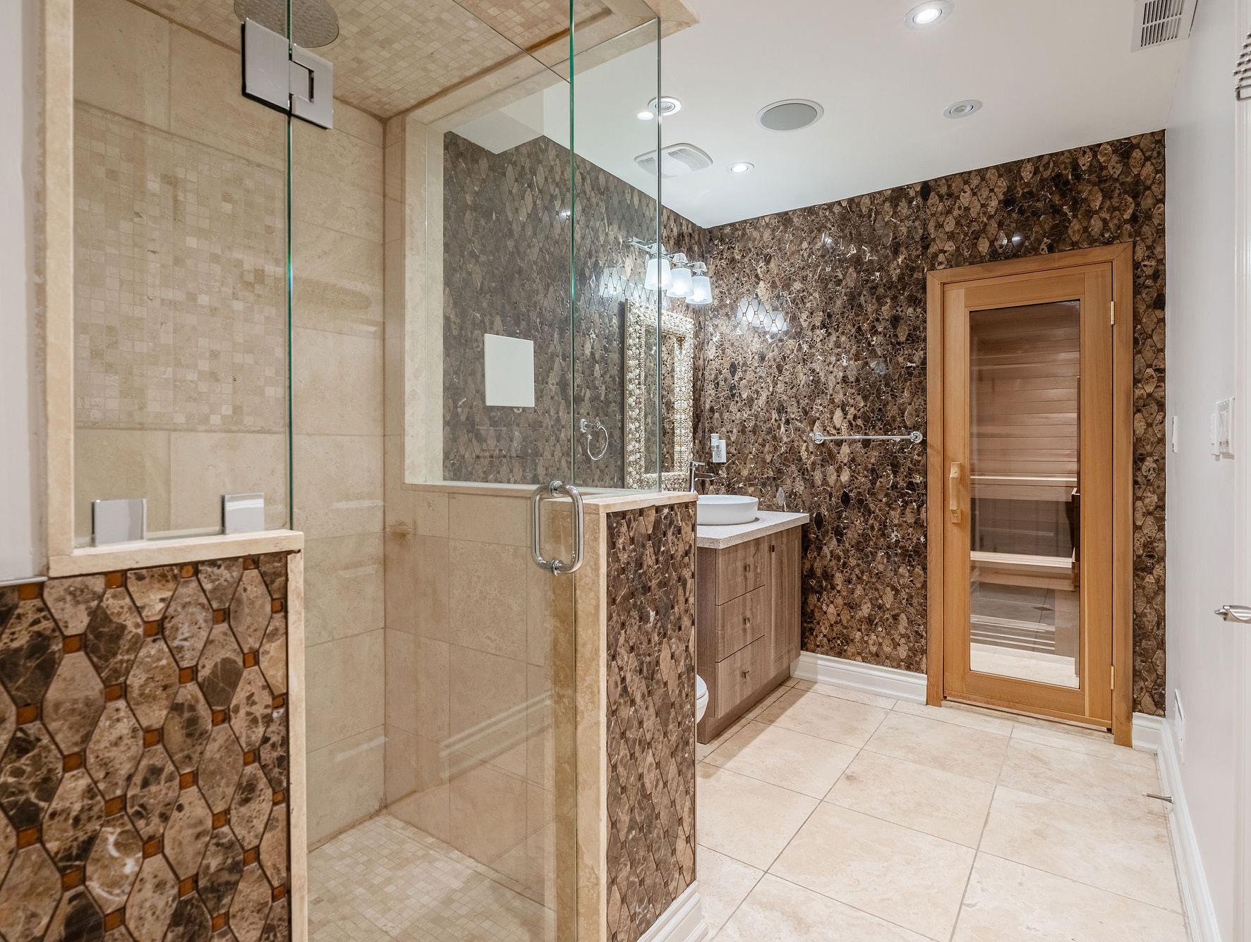 The finished walk-out lower level, accessible via two staircases (one with a private entrance), is an entertainer’s dream. This versatile space includes electric heated floors, a vast great room with a fireplace, a second kitchen, two renovated bathrooms, a sauna, two additional bedrooms, and ample storage.