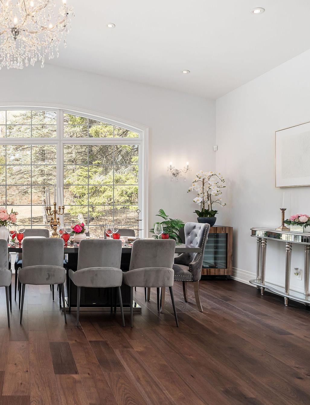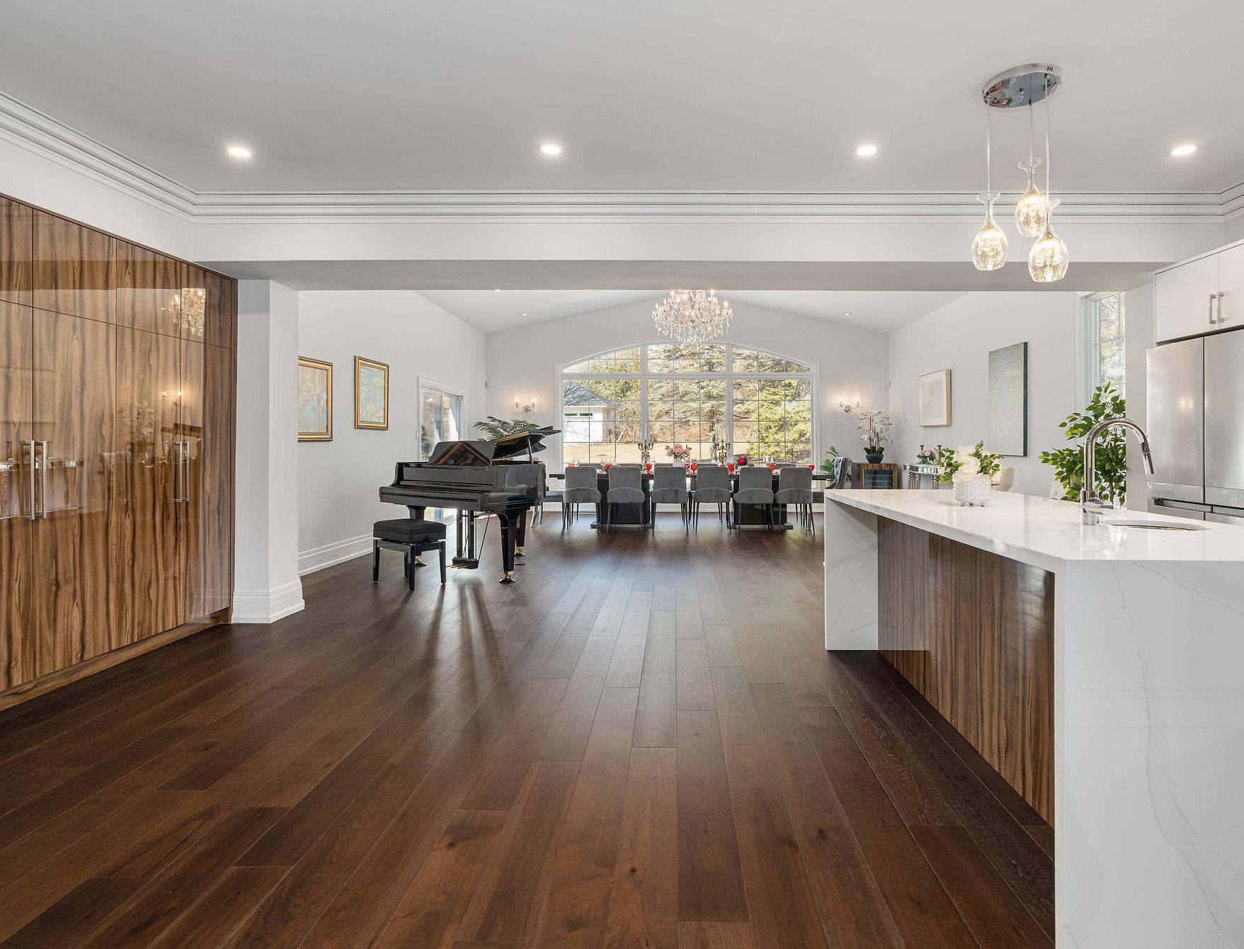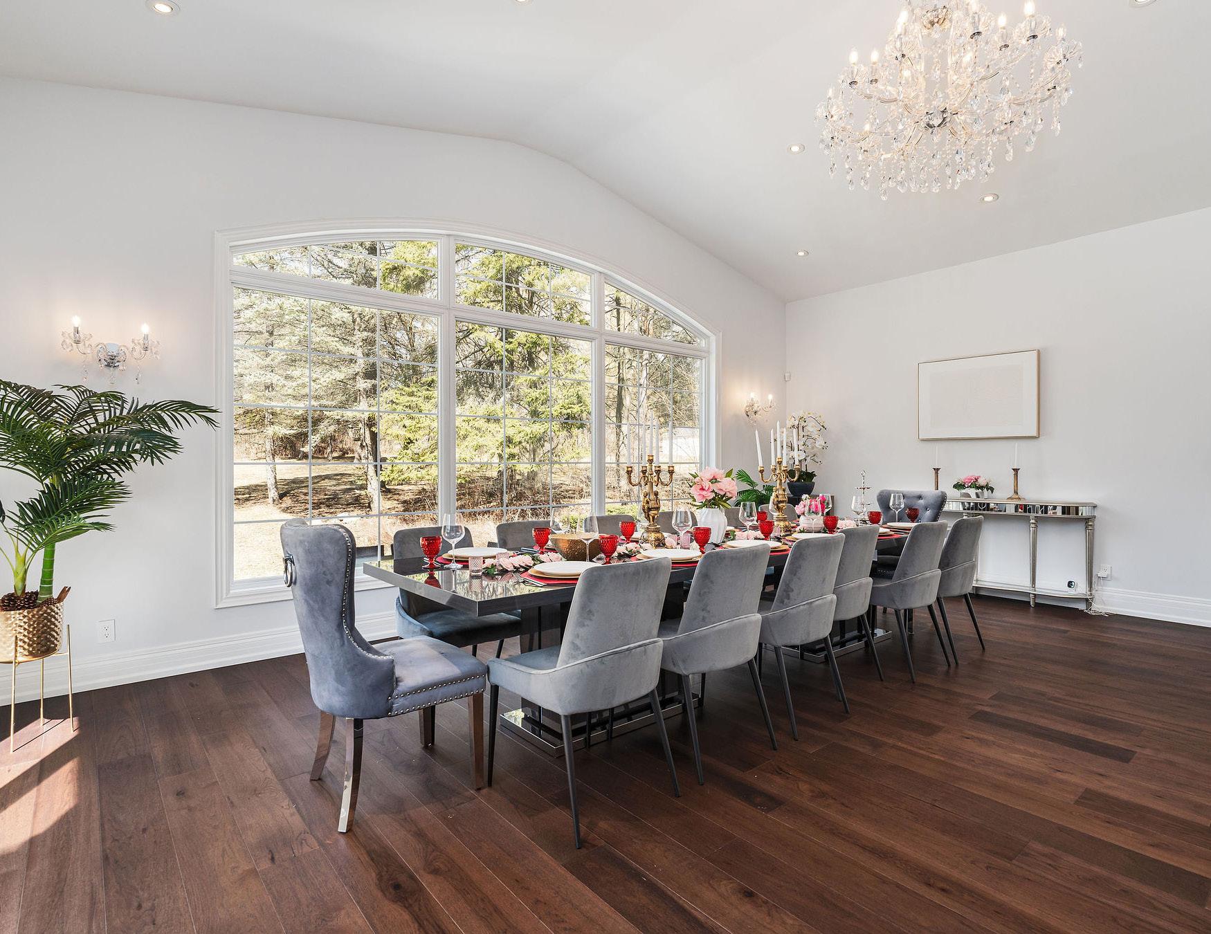 One of the most breathtaking spaces in the home is the expansive open-concept kitchen and formal dining area. The dining room features soaring vaulted ceilings and a spectacular wall of oversized windows that frame peaceful views of the private backyard. A walk-out connects seamlessly to the outdoor space, perfect for indoor-outdoor entertaining. Designed for hosting on a grand scale, this area easily accommodates large gatherings while maintaining a warm and elegant atmosphere.