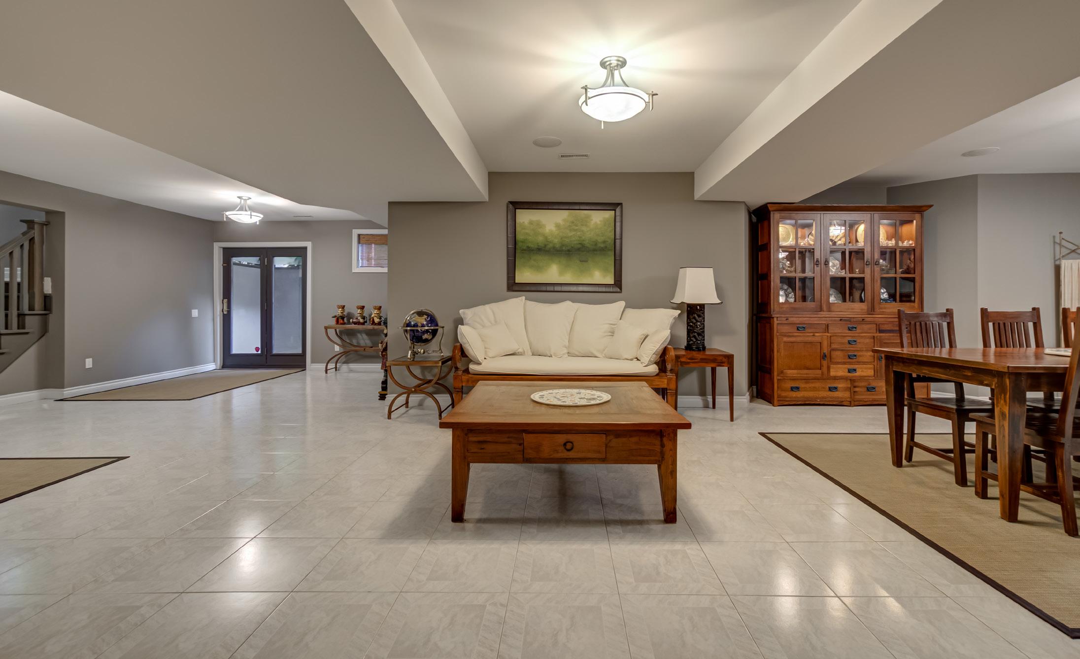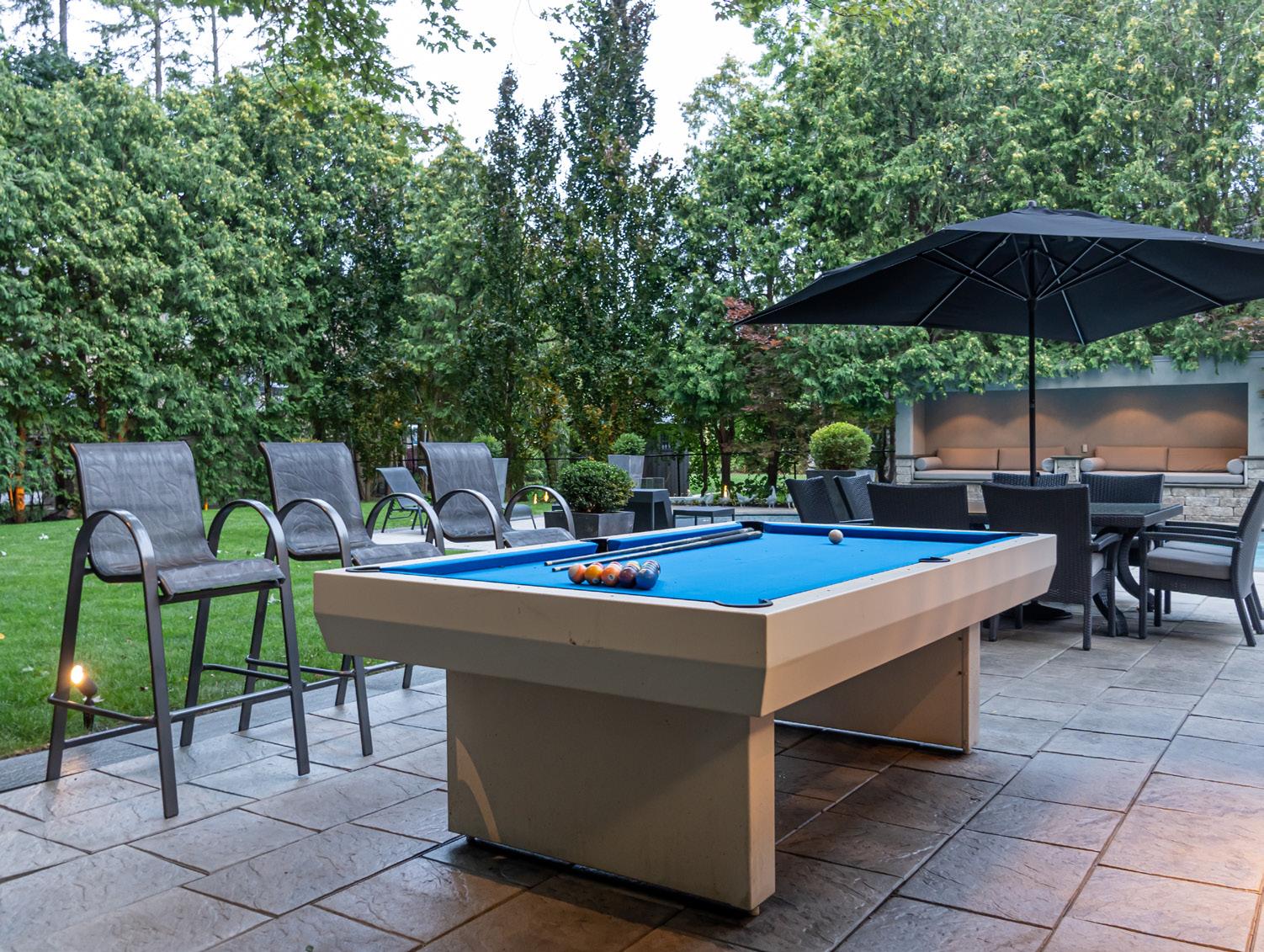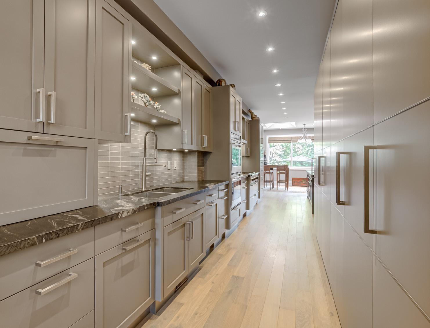 The fully finished lower level boasts excellent ceiling height and offers an oversized recreation room, a bedroom, a workshop, an extra kitchen, a spa with a sauna, and a walk-up to the resort-like backyard.