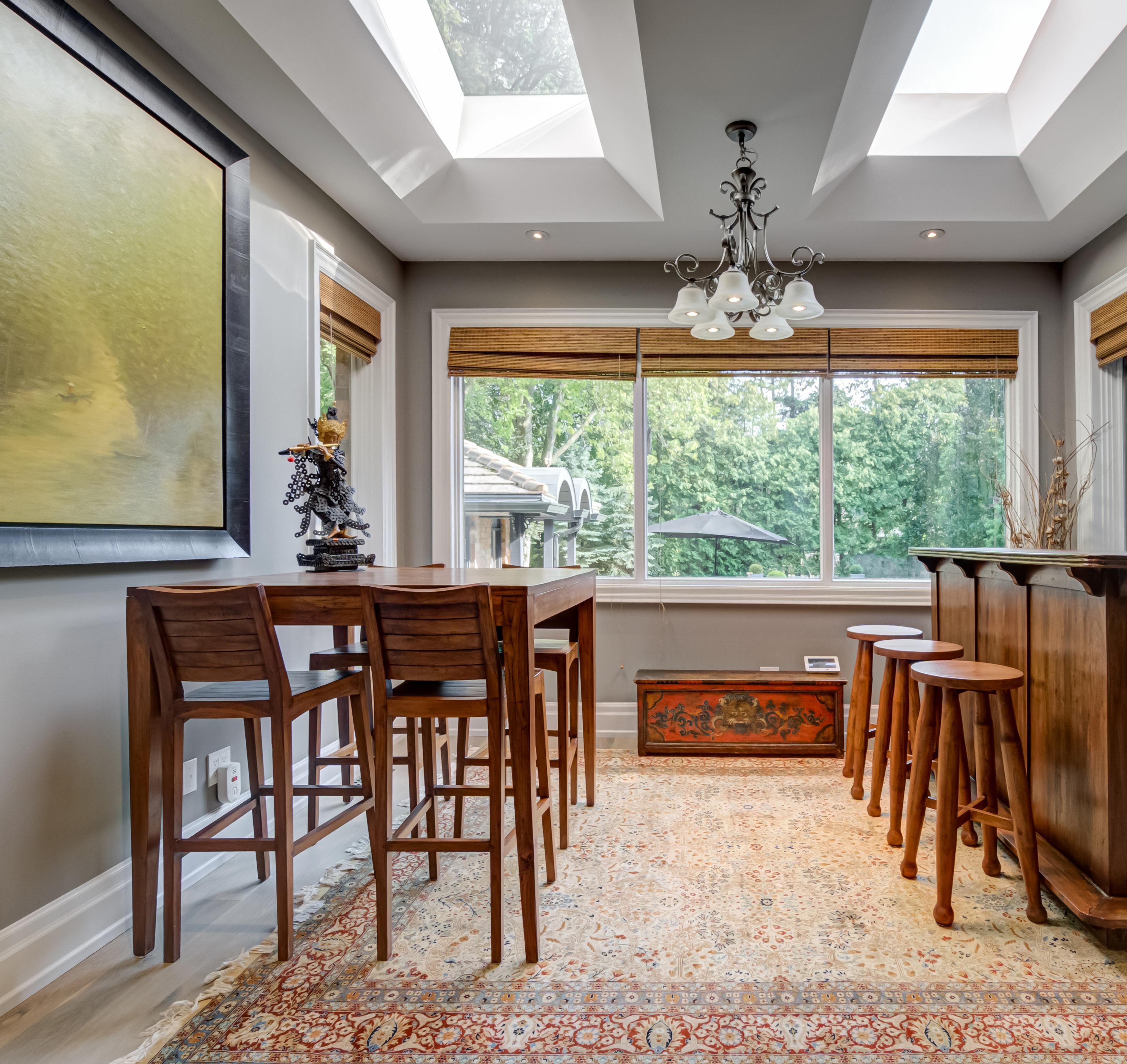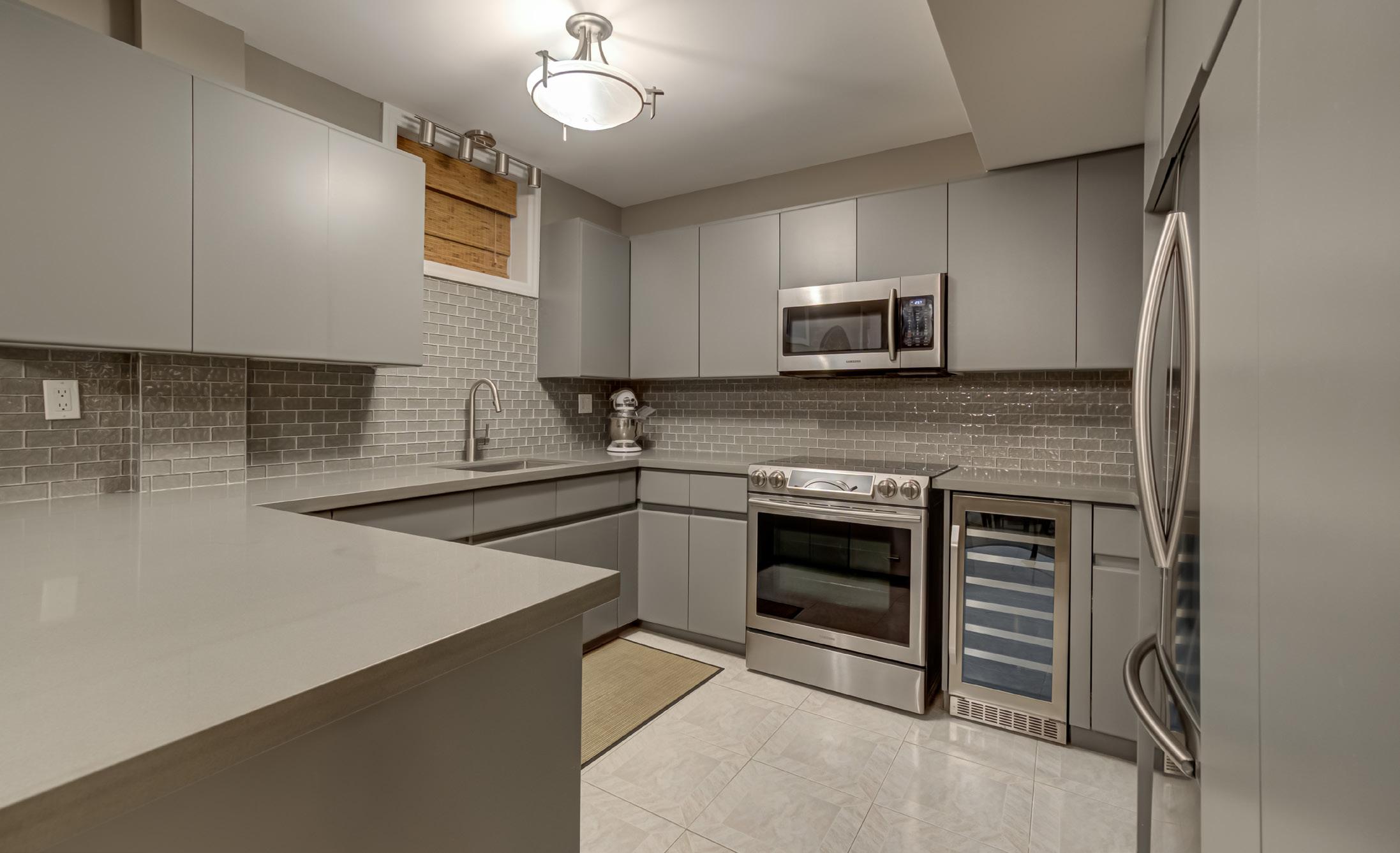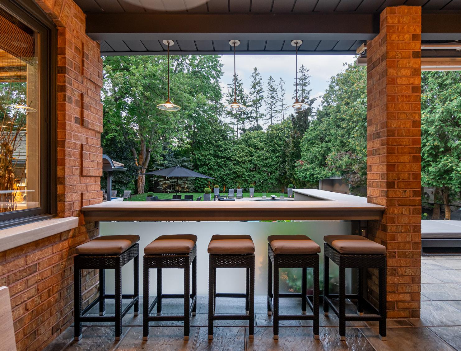 The fully finished lower level boasts excellent ceiling height and offers an oversized recreation room, a bedroom, a workshop, an extra kitchen, a spa with a sauna, and a walk-up to the resort-like backyard.