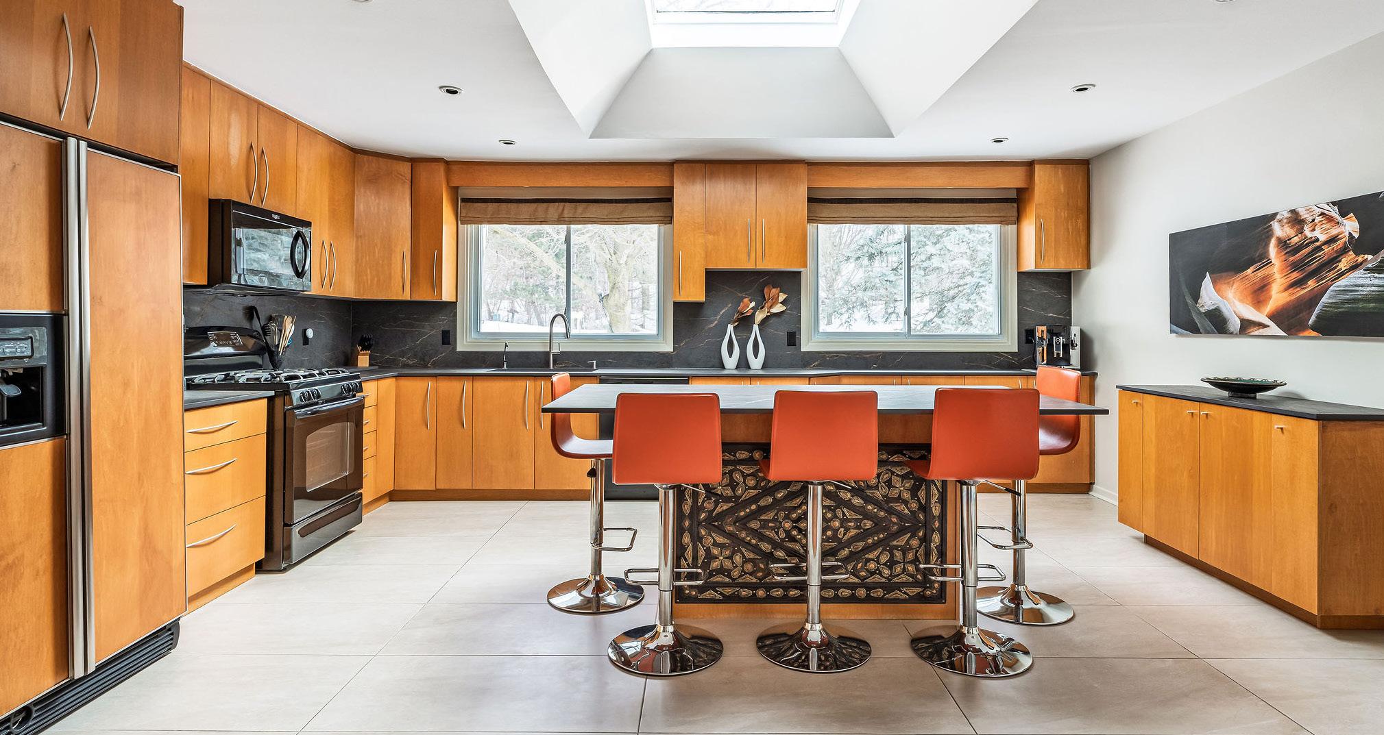Chef’s kitchen – High-end Dekton countertops, a central island, a sleek backsplash, and a skylight
