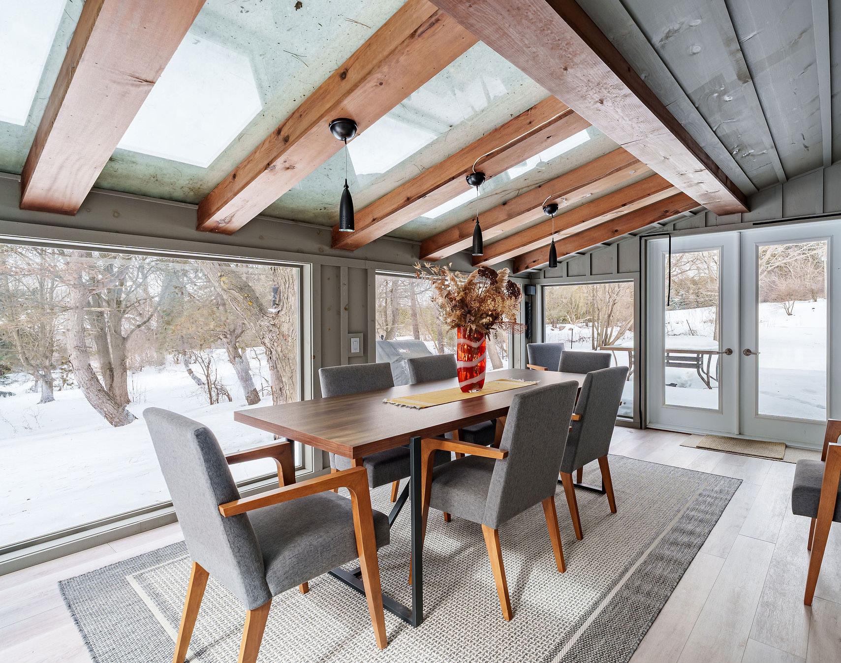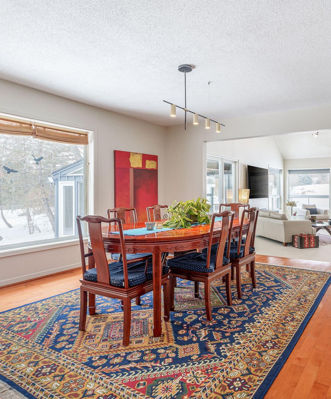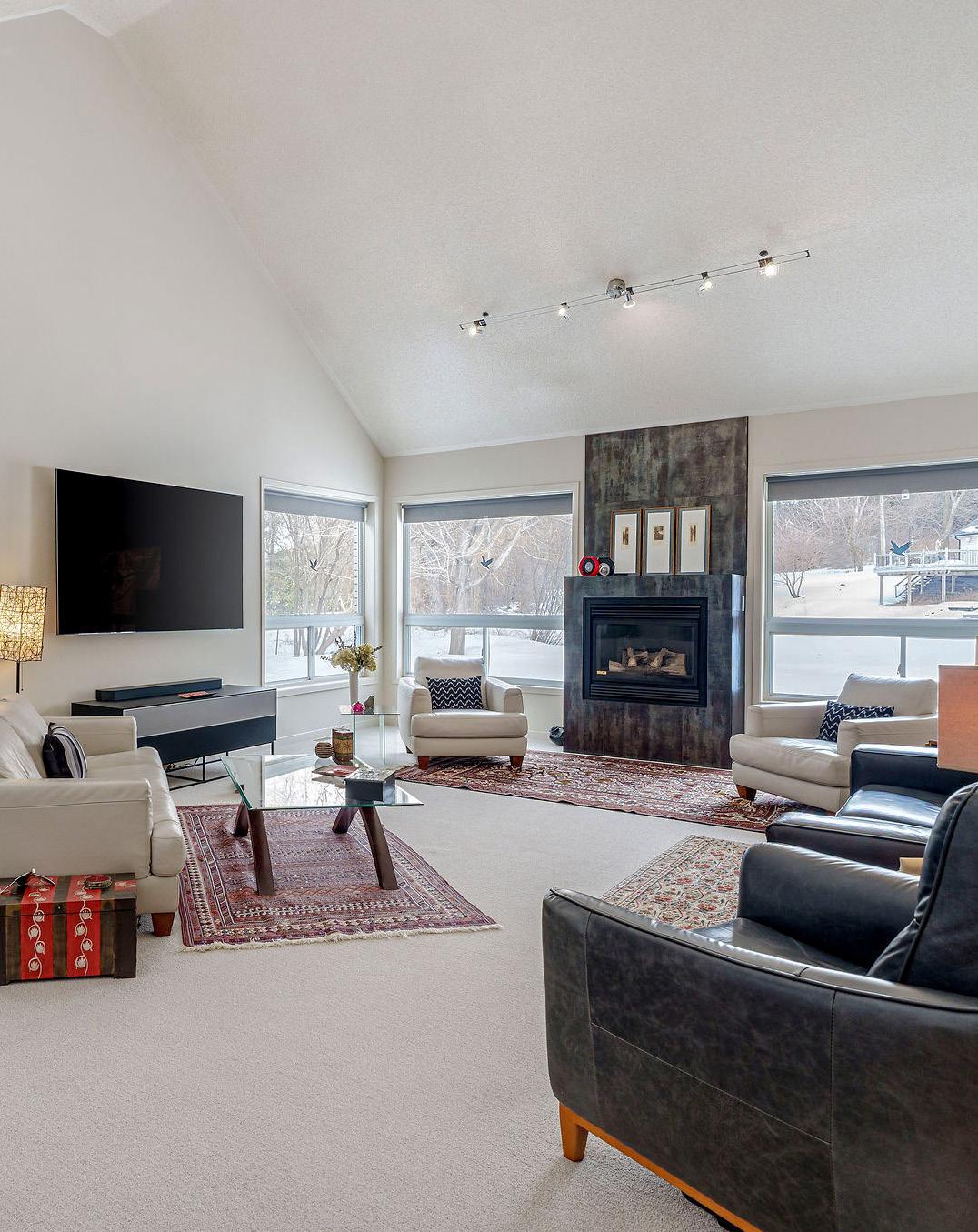 Elegant living & dining – Open-concept with a double-sided wood fireplace and garden views