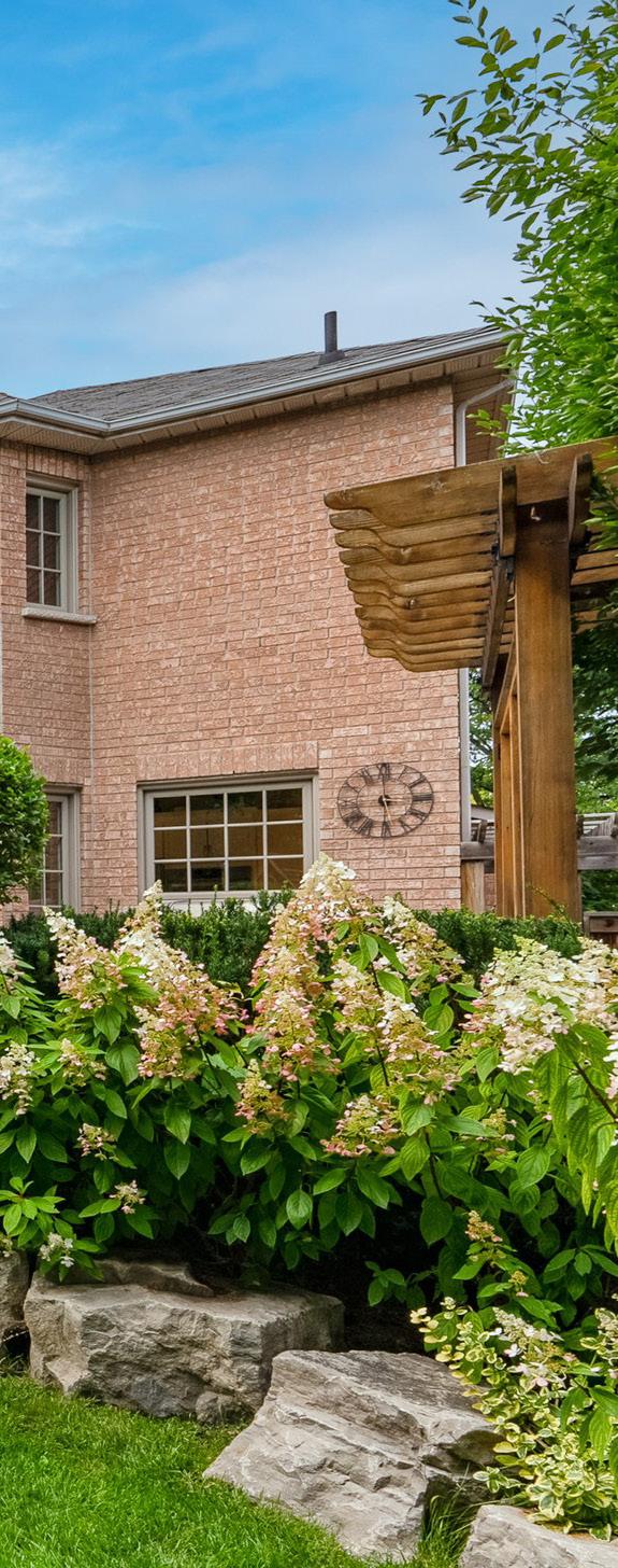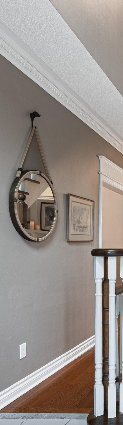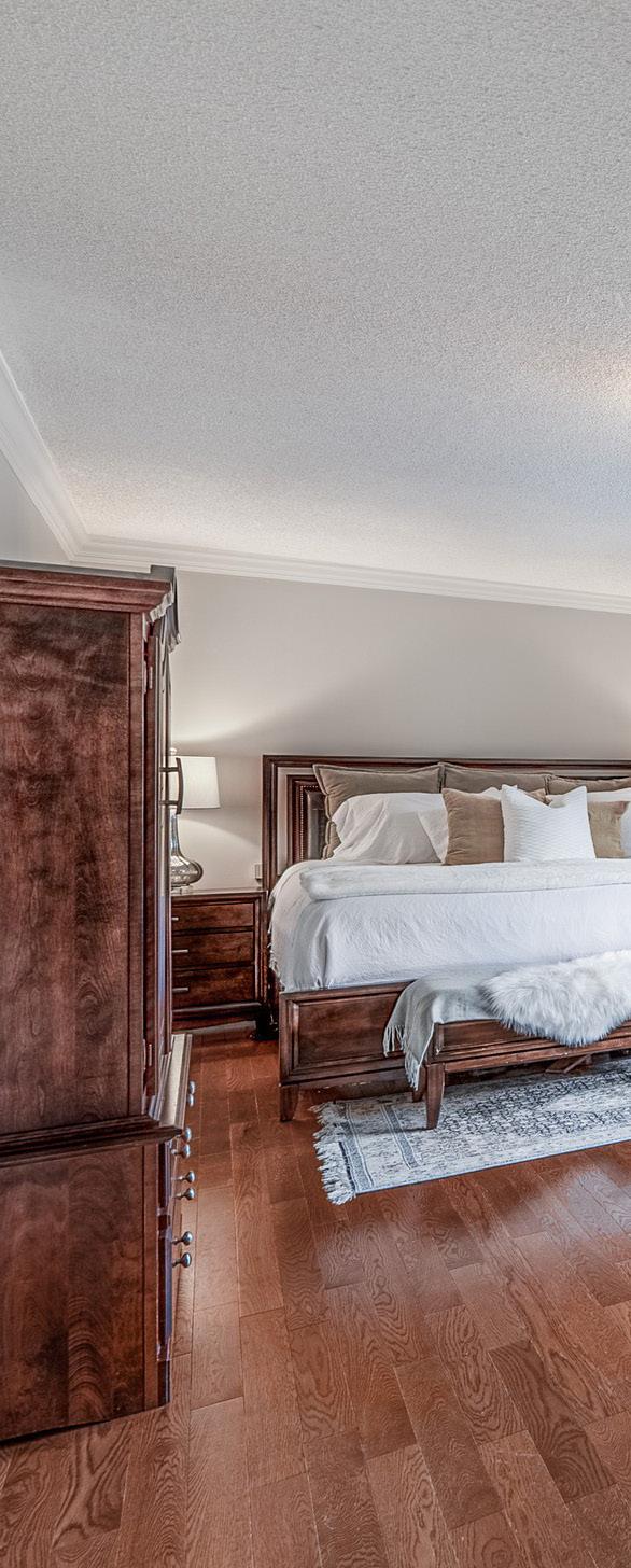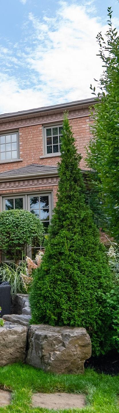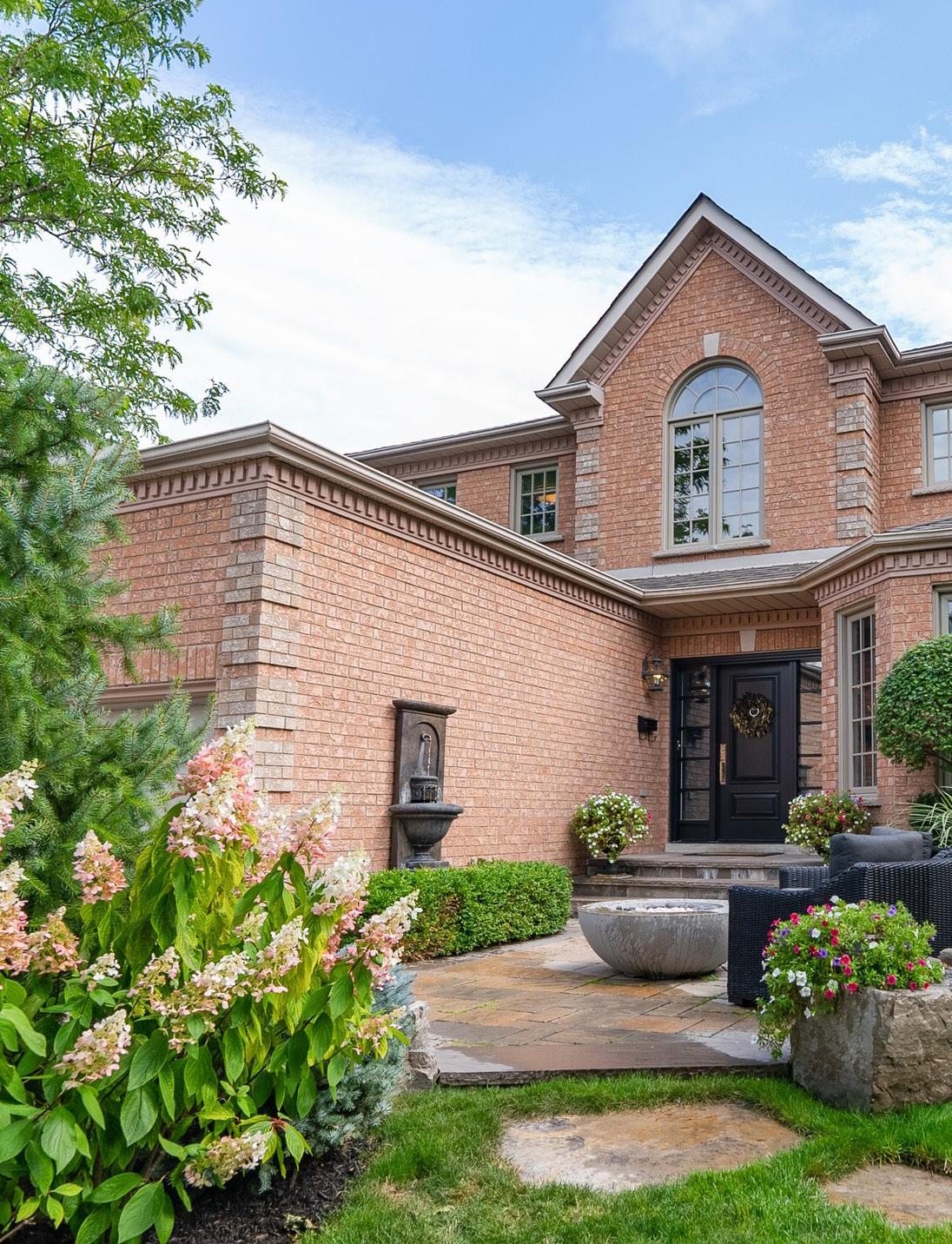 The living room features a lovely bay window that overlooks the front garden and a stunning outdoor sitting area with a gas fire pit and tranquil fountain –unique features compared to most homes. The warm and inviting family room boasts a custom-designed “Victorian” mantle with a high-efficiency Europeanmade wood-burning stove with a glass door.